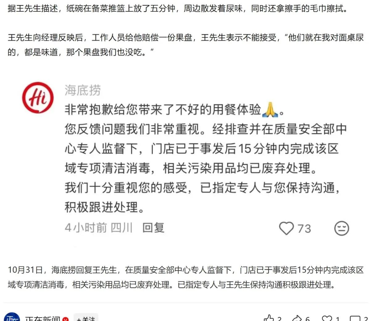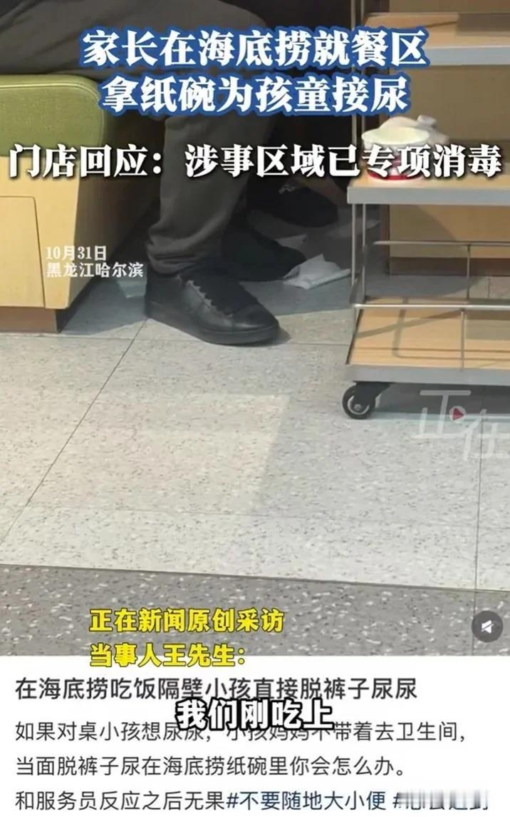 家长在海底捞就餐区拿纸碗为男童接尿 10月31日,黑龙江哈尔滨。王先生向《正在新闻》反映,他于10月30日晚上8点在海底捞(哈尔滨银泰店)就餐时,发现邻桌小孩直接公共场合撒尿。 王先生称,当时孩子对他妈妈说想上厕所,“孩子妈直接给他抱起来,屁股对着我们,顺手拿了一个小纸碗接着,直接就放在备菜的推篮上。" 消息 注意饮食卫生 出门在外保护自己 整治社会不良风气
