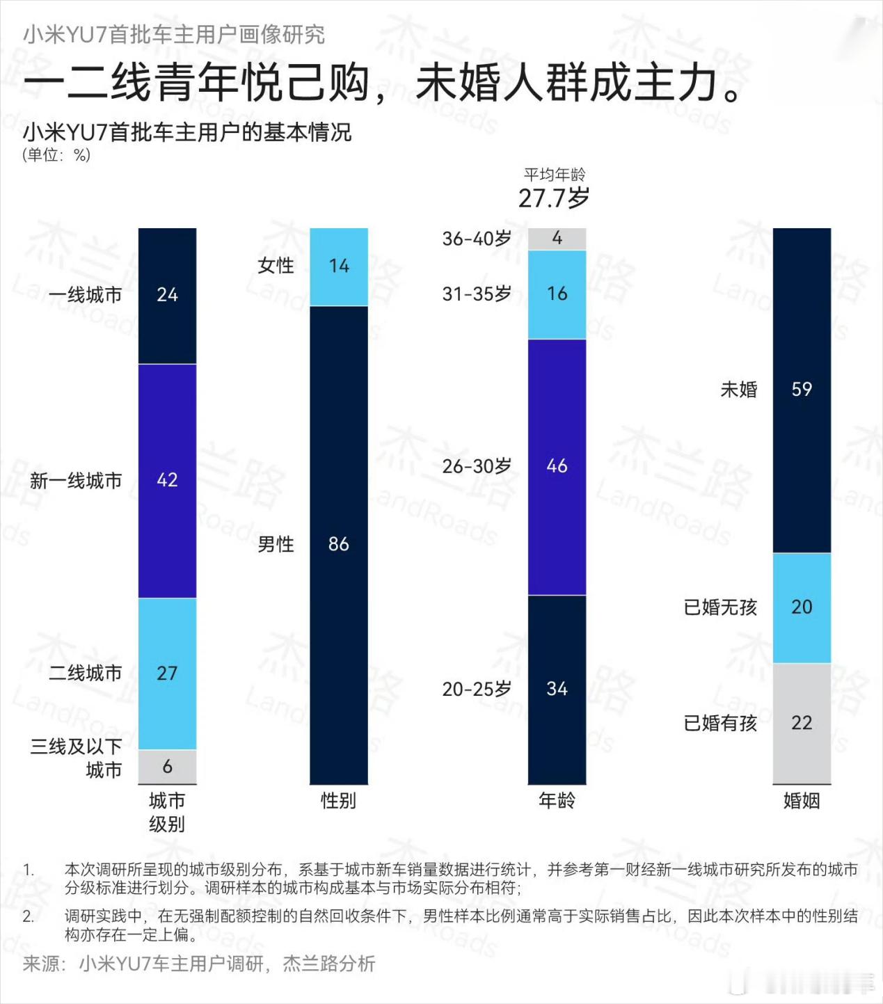 要说新能源汽车圈里的新玩家也不少了,可能像小米这样,把跨界造车玩这么溜的,还真没几个。更有意思的是杰兰路那个关于小米YU7的用户画像报告,还挺颠覆认知的。27.7岁的平均年龄、31.4万的家庭年收入,甚至用户不是小米“抢”来的,而是“造”出来的,把本来没打算买车的年轻人硬生生变成了车主,顺手又拦住了特斯拉想当“汽车圈苹果”的路。