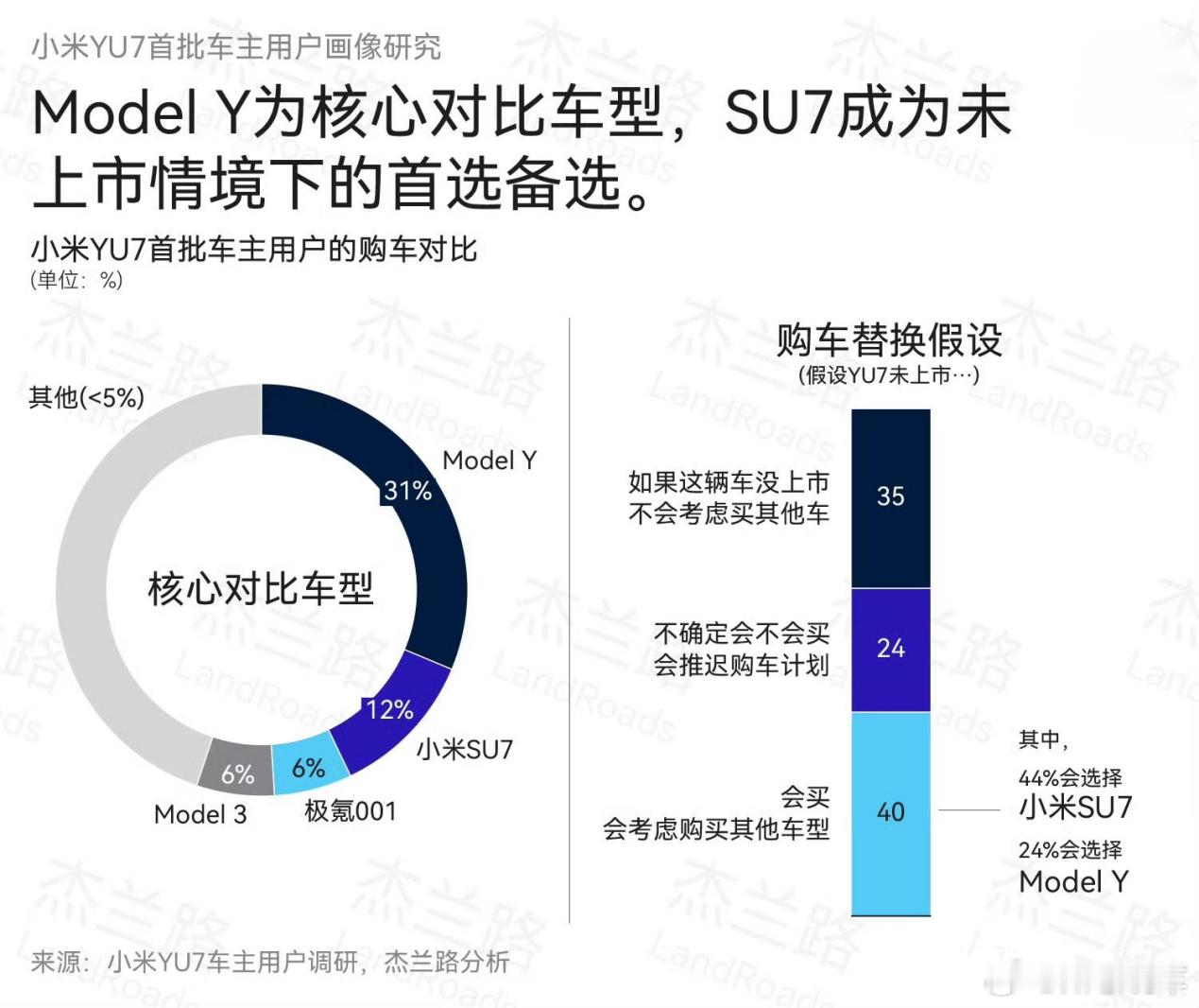 再来看车主的选车逻辑,虽然31%的人会拿特斯拉 Model Y当对比,但如果YU7没上市,44%的人会转头买小米SU7 。这哪是“对比竞品”,分明是心里早有了主意。