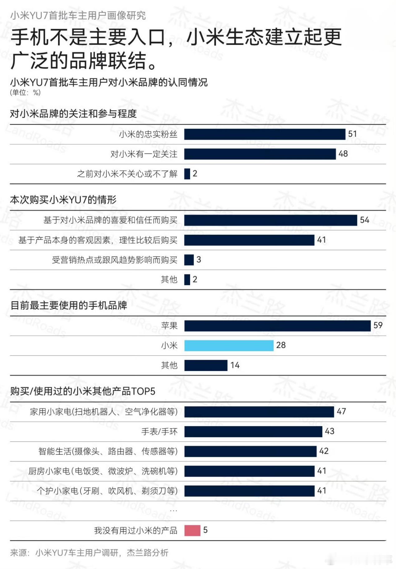 更好玩的在后面,超五成YU7车主说自己是“米粉 ”,结果只有28%用小米手机 ,剩下的大多用iPhone。可他们有个共同点,几乎都买过小米的家电。这才是小米最牛的地方:它不靠手机绑住用户,而是靠家里的各种小电器,让用户天天都能接触到小米品牌。你可能用着苹果手机,但扫地、做饭的时候都得跟小米打交道,时间长了自然有好感。别的车企搞智能生态,总围着车载系统转,小米却早把生态扎进了用户的日常生活,这就是区别。