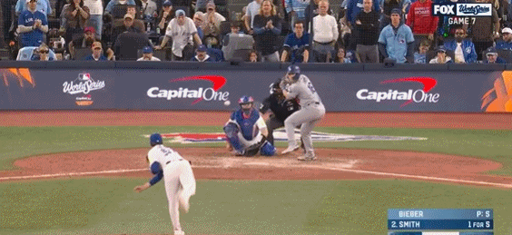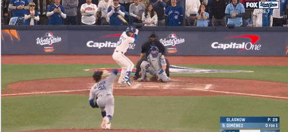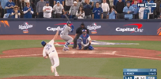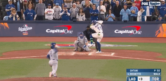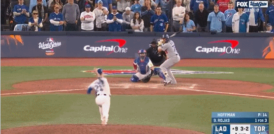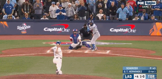 第4局特奥斯卡-埃尔南德斯击出扎实平飞球,蓝鸟队道尔顿-瓦肖扑接没收,不过也让三垒上跑者有充裕时间跑回道奇首分。道奇1-3落后蓝鸟。