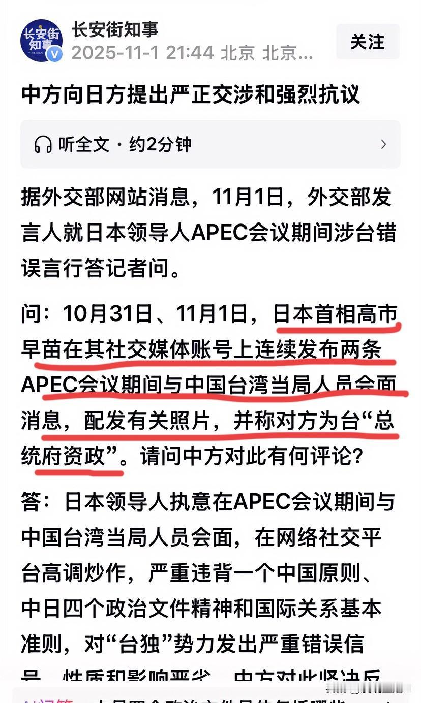 高市早苗APEC会议期间竟然偷偷与中国台湾地区执政人员见面,,称对方为台湾“总统府资政”。 台湾就是台湾省,中国的一个行政地区,地球上并没有“台湾国”,哪里来的“总统府”? 高市屁股还没坐稳就急不可待地插手台海,充当美国在亚太地区“反华”急先锋,其实就是想告诉美国:看,我的价值多大?