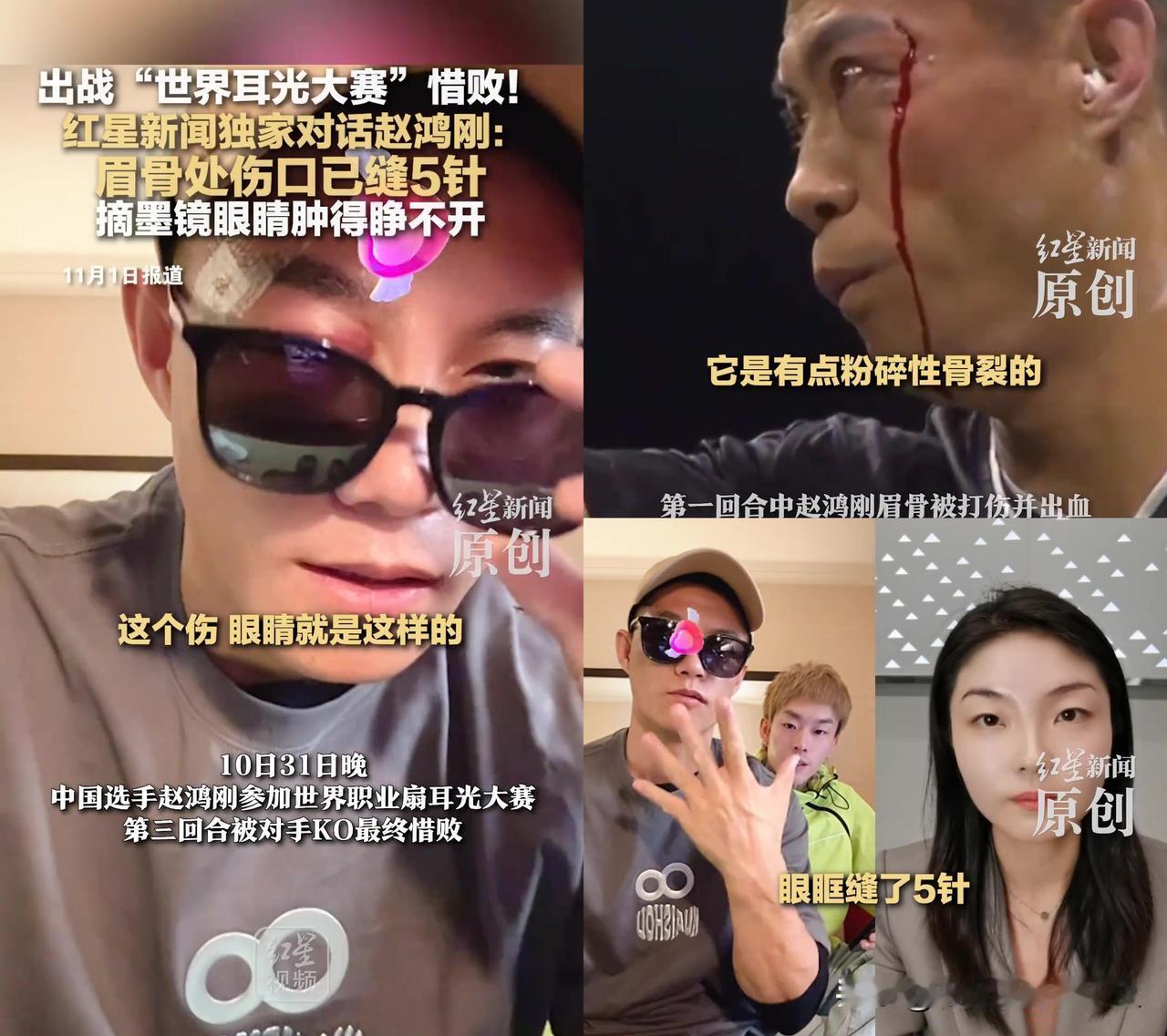 这个刚从国外回来的中国男人,摘墨镜得别人帮,并非耍帅,只因眼睛肿得睁不开,眉骨缝5针的伤口还渗着血,可大家全在喊他英雄? 他叫赵鸿刚,去打世界耳光大赛,规则特狠:不能躲、不能挡,两人面对面轮流扇。第一回合就被扇得眉骨出血,他紧握着拳头没喊停,硬扛到第三回合才倒在台上。 有人调侃“通背拳没加成”“师傅养鸽子该出山”,也有人说“敢站上去就是真男人”。 并非鼓吹暴力,这股“明知会疼还敢拼”的劲,太像我们了,加班到凌晨咬着牙敲键盘的你,陪孩子熬到12点写作业的妈,为父母治病四处凑钱的顶梁柱,谁不是这么硬刚过来的? 你觉得这种拼值吗?如果是你,敢不敢站到那个不能躲的擂台上?