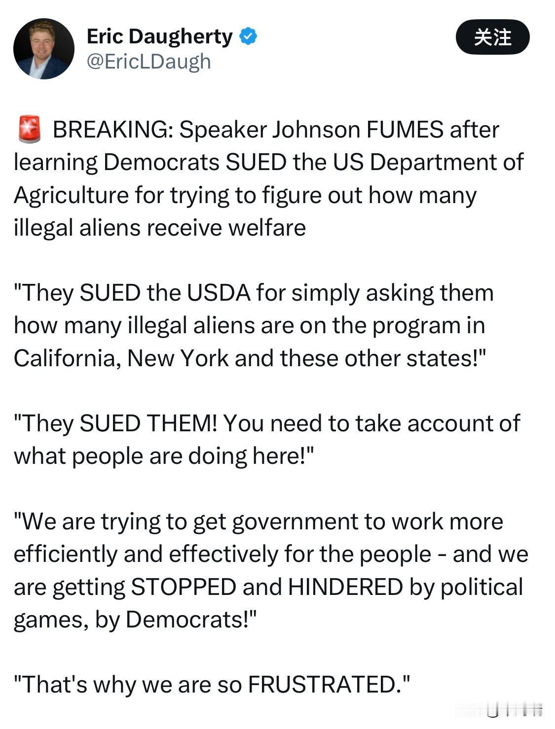 突发新闻:美国国会众议院议长约翰逊勃然大怒!民主党竟然对美国农业部提起诉讼,只因该部门试图调查有多少非法移民正在领取福利。 约翰逊表示:“他们居然起诉农业部,只因农业部想知道在加州、纽约等州,有多少非法移民注册了福利项目!” “他们竟然起诉他们——你能相信吗?!” “我们正在努力让政府对美国人民更加透明、高效,可民主党人却不断用这些政治作秀来阻挠我们。” “难怪美国人民感到如此愤怒!”
