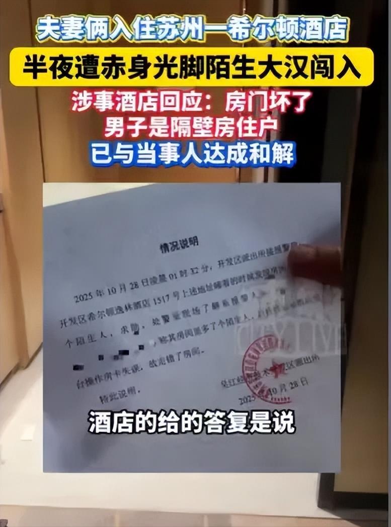 江苏苏州,男子和妻子住酒店,三更半夜,妻子尖叫一声,男子醒来,两人发现,床头站着一个光脚赤身的大汉,男子过了十几秒才反应过来,询问对方,到底是干什么的,大汉支支吾吾,男子害怕对方是坏人,就赶紧让对方先出去,这才报警打电话给酒店,事后酒店回复,对方是走错的。 孙先生和爱人结婚多年,这次趁着有时间,就特意安排了一次短途旅行,目的地选在了风景秀丽的苏州。 两人白天游览了拙政园和平江路古街,一路上拍照、吃小吃,感受着江南水乡的温柔气息。 傍晚时分,他们拖着行李回到车上,查找早已在网上收藏的几家酒店。 他们最终选中了位于吴江区的敏华希尔顿逸林酒店,这是一家国际品牌连锁,口碑不错,环境也相对安静,交通便利。 前台身着笔挺的制服,笑容得体。 孙先生递上身份证和预订信息,工作人员熟练地操作电脑,为他们办理入住手续。 办完手续后,爱人提着随身包,孙先生拖着行李箱,乘电梯上楼。 夜已深,孙先生和爱人早已熟睡,酒店房间里只亮着床头昏黄的壁灯。 突然,一声尖叫划破寂静,是妻子发出的。 孙先生猛地惊醒,心口一紧,转头一看,床头竟站着一个光脚、赤裸上身的男子。 那人身材高大,脸色模糊在灯光里,喘着粗气,一动不动地盯着他们。 短短几秒钟,孙先生只觉得头皮发麻,心脏几乎要从胸口跳出来。 妻子蜷缩在被子里瑟瑟发抖,声音发颤地问:“你是谁?” 男子沉默不语,只是愣愣地站在那里,似乎还没回过神。 过了十几秒,他才支支吾吾地说:“我……走错房了。” 孙先生不敢贸然靠近,脑子飞快转动,这人光脚进来,连衣服都没穿整齐,怎么看都不像普通住客。 他怕对方有危险性,压着声音说:“你先出去,我们打电话给前台处理。” 说完,他一边护着妻子,一边指向门口。 那男人犹豫片刻,神情慌乱地转身,赤脚踩着地毯,匆匆离开。 房门“嘭”地一声关上,孙先生这才反应过来,浑身冷汗直流。 他立刻拨打酒店前台的电话,语气急促地说明情况,同时报警求助。 几分钟后,酒店工作人员和保安赶到房间查看,并不断道歉。 而令他们惊愕的是,酒店给出的解释竟然只有一句“那位客人喝醉了,走错房间。” 孙先生难以接受这样的说法,质问酒店为何房门会被陌生人打开,安全系统是否存在漏洞。 妻子此时仍惊魂未定,手还在发抖。 那一夜,两人几乎彻夜未眠,心里的恐惧久久无法平息。 工作人员态度看似诚恳,却只是反复解释说:“先生,实在抱歉,这位客人是隔壁房的住户,因为前台在录入房卡时操作失误,导致那位客人的卡也能打开您这间的门,他本人喝多了,以为这是自己的房间,就误进来了。” 听完这番解释,孙先生的眉头越皱越紧。 他冷冷地问:“就算房卡弄错了,他也得试着开门吧?那门为什么能直接推开?而且我们已经睡下了,怎么一点声音都没有?” 工作人员支吾片刻,只说会向技术部门反馈,然后草草表示歉意。 可孙先生的心里,却越想越不对劲。 那人光脚站在床头的画面,依然在他脑海里挥之不去,陌生人深夜能轻易闯进他们的房间,这样的“走错”实在太诡异。 酒店的解释听起来合理,却解释不了最关键的问题:门是怎么开的? 直到第二天早上退房前,孙先生才想起一个被忽略的细节。 刚入住时,他关门试了一下,发现房门的吸合装置有点松,不推到底,门就无法完全锁上。 但奇怪的是,门没有自动报警,也没有提示未关好。 那时他没多想,只以为是小问题。 可现在回想起来,他清楚记得,睡前他确实亲手把门关紧了。 这意味着两种可能,要么门锁系统存在严重漏洞,要么酒店所谓的“操作失误”只是掩饰。 想到这里,孙先生心里泛起一阵凉意,在一家五星级品牌酒店,自己和妻子的安全竟然全靠运气。 事情的后续,是道歉和赔偿,但对孙先生妻子造成的伤害,却远不是钱能弥补的。 事后,医生诊断她是急性应激障碍,这个医学名词背后,是一个人需要用很长时间去消化的恐惧。 这种创伤是有形的,它改变了一个人的生活习惯。 从那天起,睡觉前反复检查门锁,成了她无法摆脱的习惯。 而对孙先生来说,那种后怕感更让他心惊,如果当时房间里只有妻子一个人,后果会是怎样? 这种假设,像一根刺,深深扎进了夫妻俩的心里。 最终,酒店承认了疏漏。 但这起事件提醒了每一个人,我们入住酒店,花钱买的绝不仅仅是一张床,而是一种关于安全和隐私的基本承诺。 这个承诺,需要靠严谨的流程和合格的硬件来兑现。 同时也警示我们自己,身处陌生环境,多一份警惕总没错,检查好门窗,甚至用个门阻器,或许才是给自己最踏实的安全感。