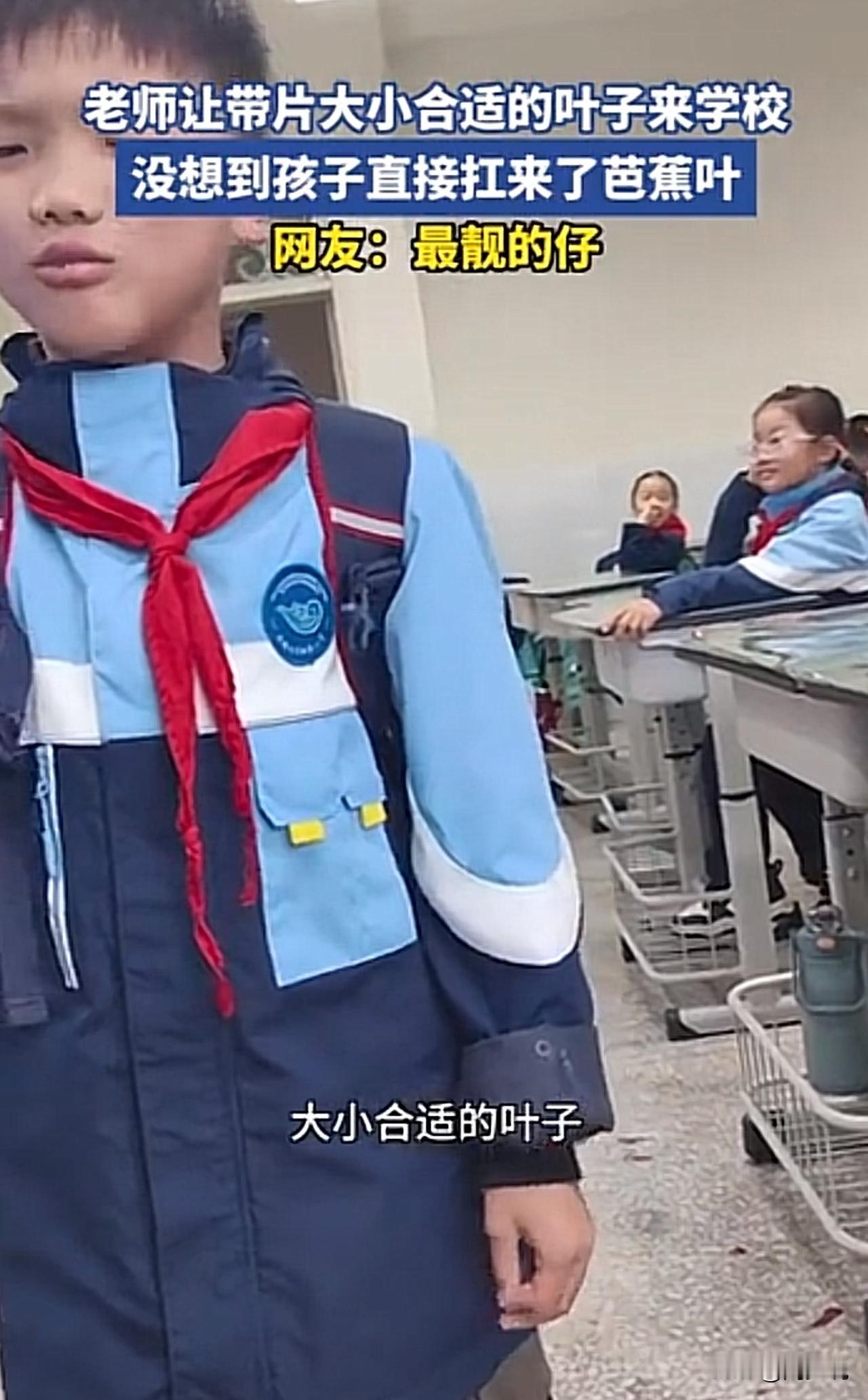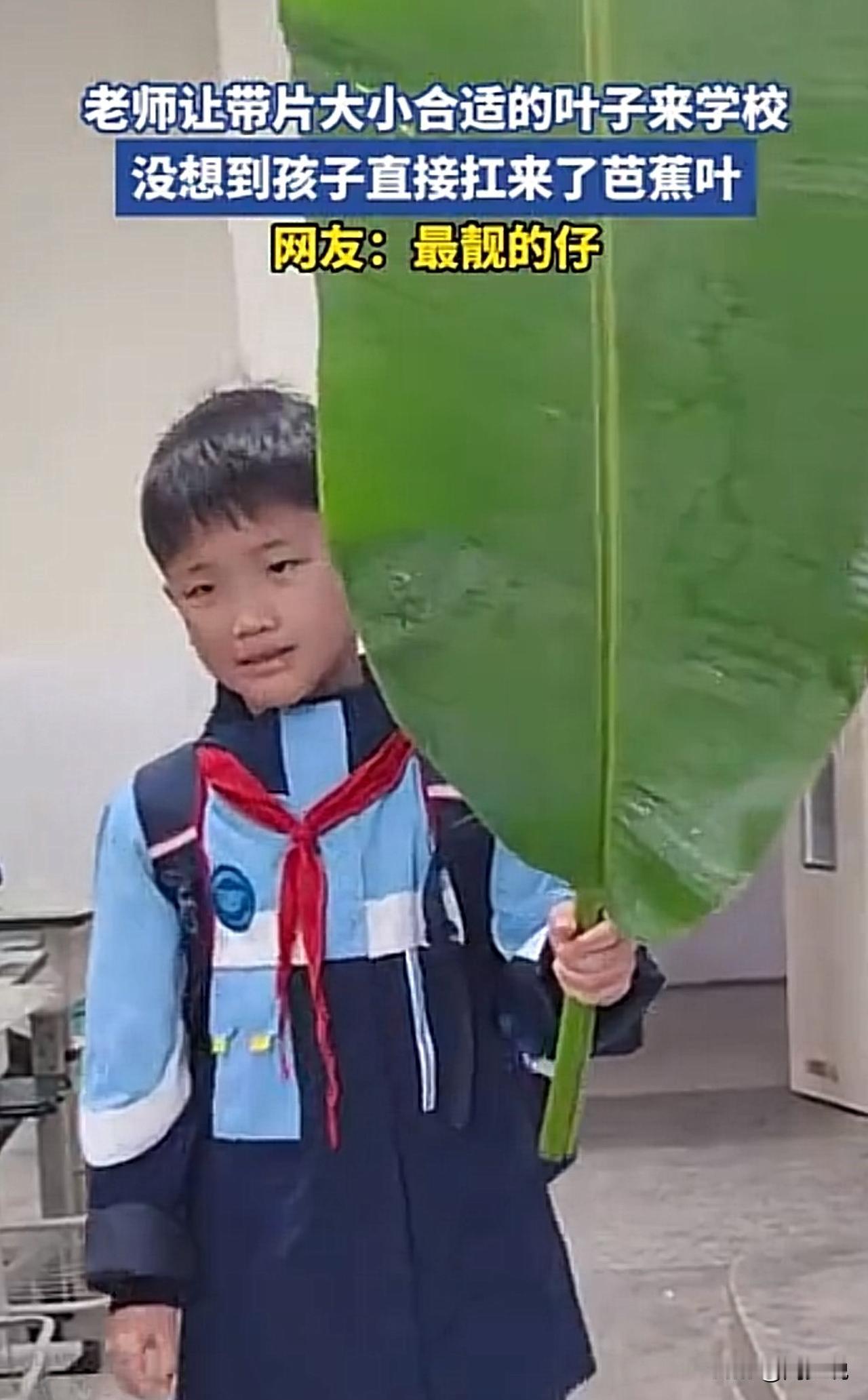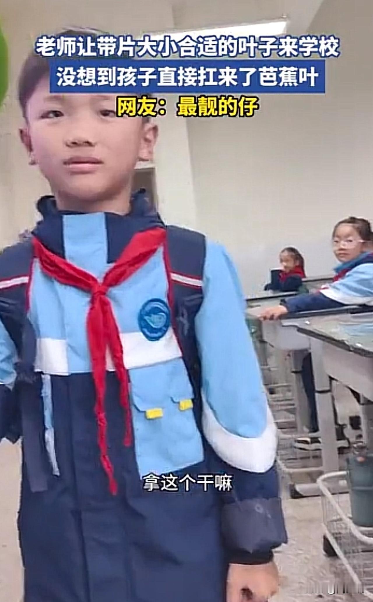 #老师让带叶子 孩子直接扛来芭蕉叶#“真是太天真太可爱了!”一学校老师让学生带片大小合适的叶子去学校,结果没想到一位学生直接扛来芭蕉叶,老师看到后瞬间就懵了,这学生连忙说“这就是大小合适的叶子”,这一幕惹得全班同学都大笑不已,纷纷表示,“这下班里所有的叶子都解决了!”。 看到这个视频,周少也忍不住夸赞这位男孩,真是天真又可爱。借用网友的话说,那片超规的芭蕉叶里,藏着未被束缚的想象力,恰是对教育标准化最生动的提醒。 对此情况,如果你是班主任,会怎么做呢?#寻美三湘# #长沙新朋友#