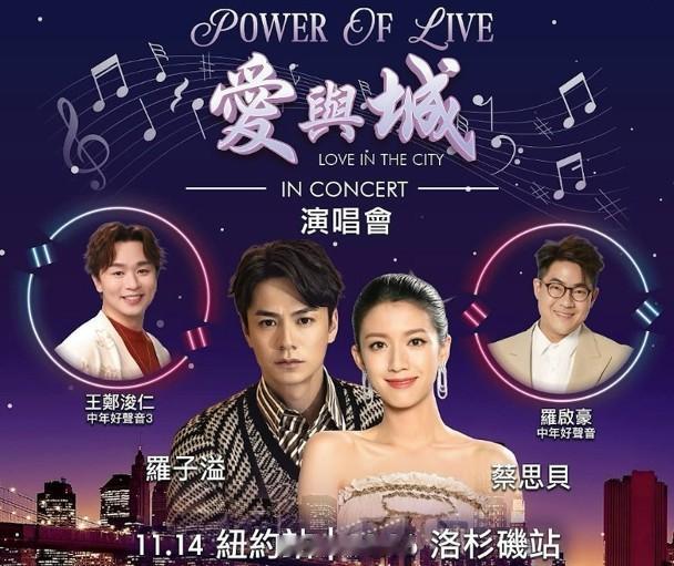 近日蔡思貝終於有新搞作,但不是拍戲,而是轉型做歌手,孖羅子溢,還有兩位《中年好聲音》歌手羅啟豪和王鄭浚仁一齊去美國登台搵真銀。蔡思貝在社交網限時動態轉發宣傳海報,今次演唱會名叫《愛與城》,分別於11月14日和16日舉行紐約站及洛杉磯站兩場,票價以美元計分三種,包括$168、$108和$68,蔡思貝以一個開心揮手emoji期待與粉絲見面。