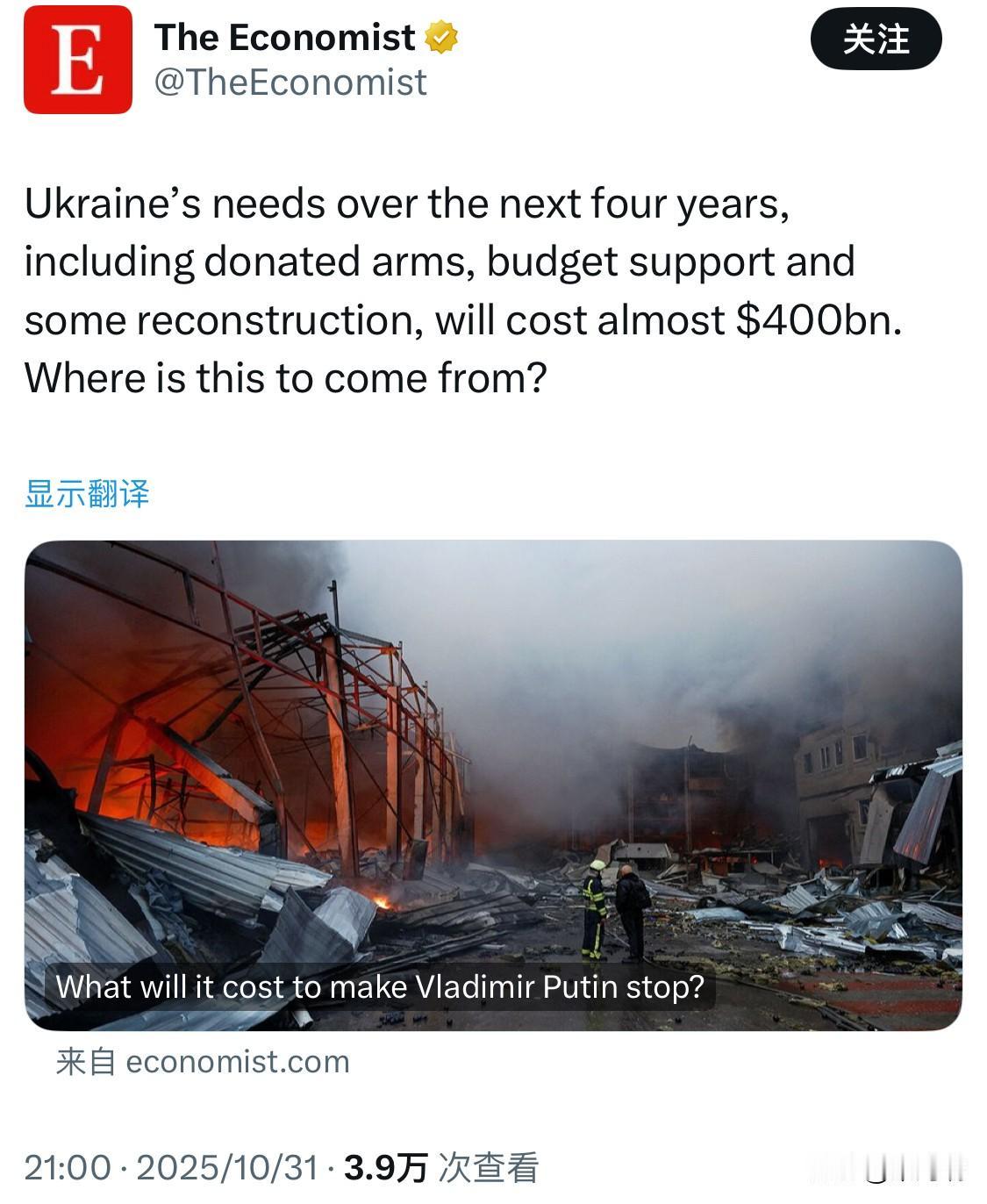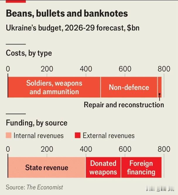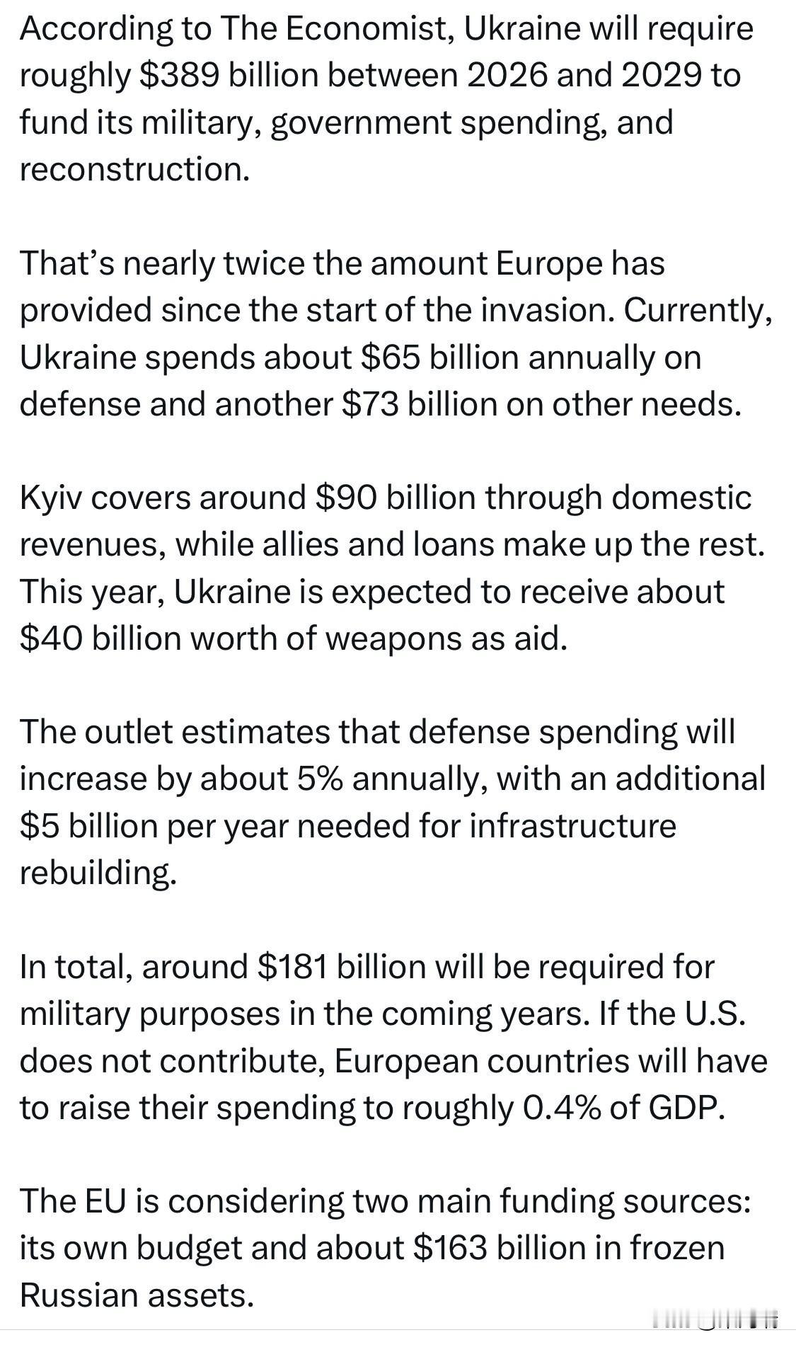 据《经济学人》报道,西方维持乌克兰运转的成本估计为 4000亿美元。欧盟和英国需要在未来四年内拿出4000亿美元,否则将面临破坏北约团结的风险。 《经济学人》周四报道称,乌克兰未来四年需要近4000亿美元的西方财政支持,以维持其对抗俄罗斯的战争,预计大部分负担将落在欧洲北约国家身上。 根据该杂志的预测,基辅每年面临约500亿美元的预算缺口,这笔资金必须由外国捐助者填补。由于现任美国政府不愿批准进一步的大规模援助,欧盟和英国预计分别需要出资3280亿美元和610亿。