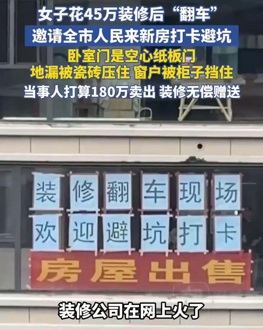 “遇到狠人了!”安徽阜阳,女子买了套160平米的大平层,找装修公司花45万装修,本以为能开开心心入住,结果验房时发现问题百出,一气之下,女子直接邀请网友“打卡避坑”,还把新房挂到网上出售,一下让装修公司火了一把 刘女士介绍,她的这套房子160平,总价180万,装修花了45万,因为人在外地,整个装修大半年,她一次都没回过现场,全凭微信和设计师沟通,本想着好好住个体面的大平层。结果到验房那天,看着一堆问题彻底傻眼 阳台的地漏被瓷砖压住,柜子深度比设计图少了10厘米,窗户被柜子挡住打不开,花9万元的柜子质量还不如市场上六七百一平的水平。 刘女士站在客厅中央,指尖划过那组号称“实木定制”的柜子,指腹能明显摸到板材边缘的毛糙,用力按一下柜门,还会发出轻微的“咯吱”声——这哪是9万块该有的质感?她想起装修时设计师在微信里拍着胸脯说“姐您放心,材料都是选的最好的,比您自己去市场挑还靠谱”,现在再看那些聊天记录,每一句“放心”都像在打自己的脸。最让她窝火的是阳台,她蹲下来扒开瓷砖缝看地漏,半截地漏被死死压在瓷砖下面,水流根本没法顺畅排走,“这要是下雨忘了关窗,阳台不得淹成池塘?” 谁没吃过异地办事的亏啊?我表哥去年在杭州工作,老家武汉买了套二手房装修,也是全靠微信跟装修队对接。一开始对方每天发施工视频,后来就越来越敷衍,要么拍个墙角糊弄,要么说“在忙晚点发”。等表哥抽空回去一看,厨房台面切得歪歪扭扭,卫生间防水还没做就贴了瓷砖,返工又花了好几万。刘女士这大半年没回现场,等于给了装修公司“自由发挥”的空间,他们知道业主没法盯着,偷工减料、不按图纸施工,自然也就没了顾忌。 再说那组9万的柜子,市场上六七百一平的柜子,至少板材厚度够、五金件耐用,关门时还能做到静音。刘女士家的呢?柜子深度少了10厘米,意味着之前看好的收纳盒、行李箱根本塞不进去;更离谱的是窗户被挡住打不开,这不仅影响通风,真要是遇到紧急情况,连个逃生的备用口都没有。装修公司嘴上说“按设计图来”,实际施工时为了省时间、省材料,怎么省事怎么来,完全不管业主后续住得舒不舒服、安不安全。 刘女士邀请网友“打卡避坑”,可不是一时冲动。她把验房时拍的视频、聊天记录、合同条款全发到网上,每一个问题都标得清清楚楚,就是想让更多人看到这家装修公司的真面目——别再像她一样,花了高价还受气。至于把新房挂出去卖,更透着一股无奈:180万的房子,45万的装修,本来是满心期待的家,现在到处是问题,看着就闹心,与其花时间跟装修公司扯皮返工,不如干脆卖掉,眼不见心不烦。这种“不将就”的态度,反而比忍气吞声更让人佩服。 现在很多装修公司都盯着“异地业主”这块“肥肉”,觉得业主没时间监管,就敢钻空子。可他们忘了,现在网络这么发达,业主只要把证据摆出来,网友的眼睛是雪亮的,一次不靠谱的装修,就能让公司的口碑彻底垮掉。刘女士这事儿也给所有人提了个醒:装修哪怕再忙,也得想办法盯着,要么找靠谱的亲戚朋友帮忙看现场,要么定期视频查工地,合同里更要把材料、尺寸、工艺写得明明白白,别给装修公司留任何“糊弄”的余地。 毕竟,谁的钱都不是大风刮来的,买房子、装房子是为了住得舒心,不是为了给自己添堵。 各位读者你们怎么看?欢迎在评论区讨论。