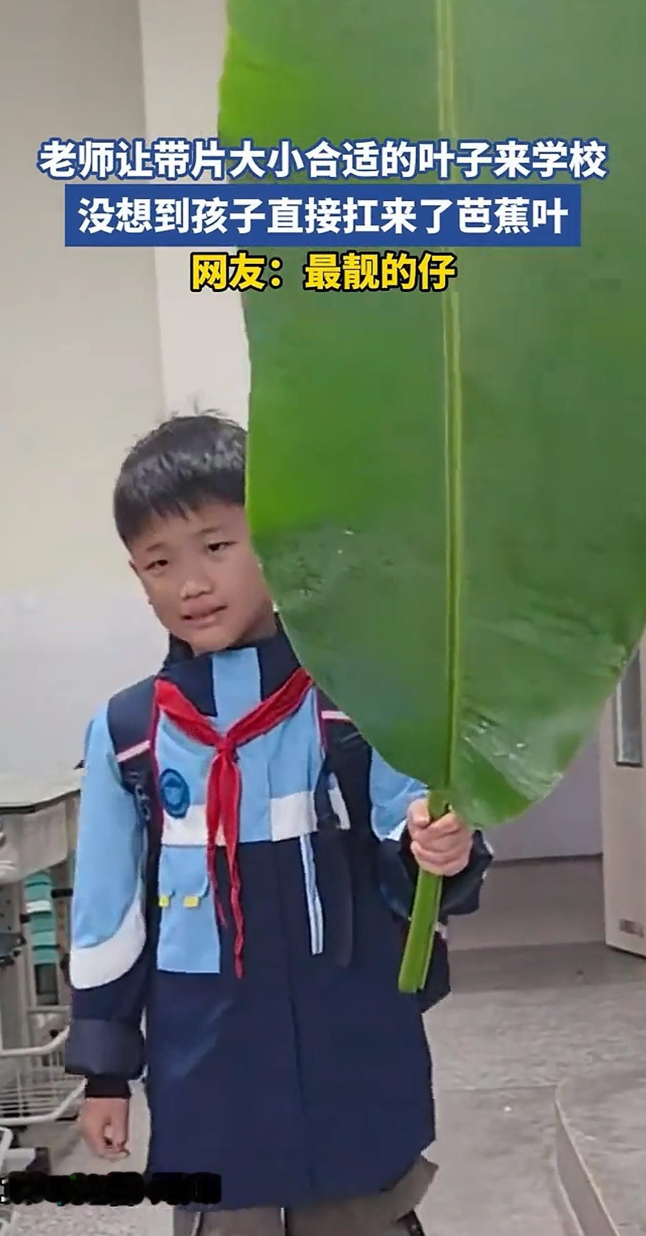 “笑不活了!”四川一老师给同学安排任务,让他们自己找片叶子上课用,可没想到,一个小男孩竟然直接扛了一片“芭蕉叶”过来,把老师都看呆了。网友:“他妈妈是铁扇公主吗?” 老师一开始说的很明白,要一片大小合适的叶子,其实就是怕同学们为难,毕竟一片小叶子,路边随手一摘就有,费不了什么事。 可这位同学不知道是误会了还是听错了,直接拿来了一片最大的,把同学和老师都看呆了。 搞的老师还有点摸不着头脑,问他拿这个干嘛,小男孩只能支支吾吾地说这就是上课要用的叶子,看着还有点怪可怜的。 有网友说,这么大的叶子,估计二十年后班上的同学都还记得。 也有网友说,这个家长有心了,他肯定是知道大家都会带普通叶子,所以专门给孩子扯了片芭蕉叶。 还有网友说,老师要不要表扬一下他啊,看叶子这么干净,应该提前洗过了。 说真的,这片芭蕉叶在课堂上可能起不到什么作用,但却会给同学们留下印象深刻的记忆。不管再过多少年,这片叶子都会被他们记在心中,其实不也蛮好的吗? 老师让带叶子 孩子直接扛来芭蕉叶