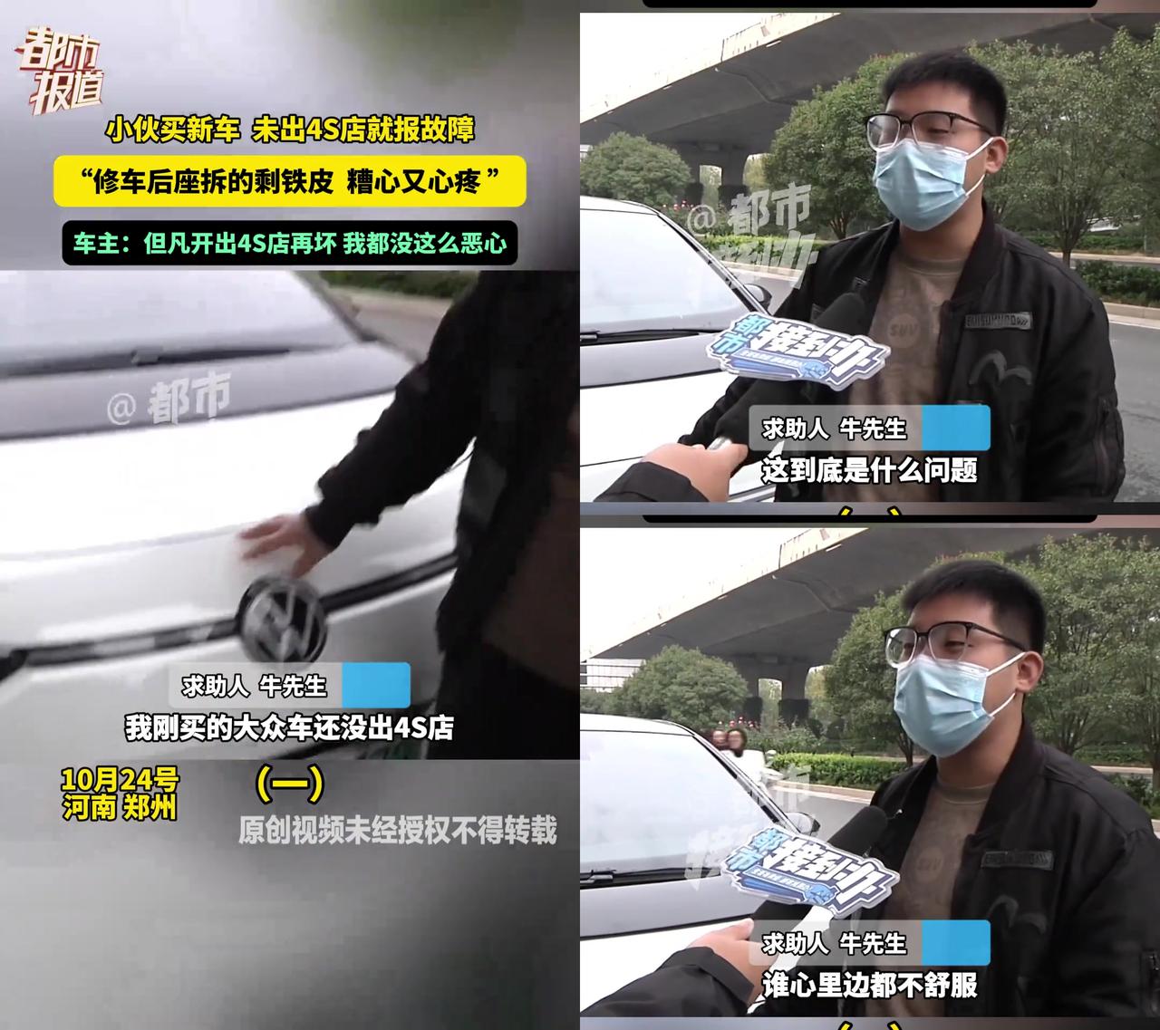 谁懂这种烦心!刚提的新车还没出4S店门,就给整崩了! 郑州牛先生10月24号买大众电车,刚坐上去故障灯就亮。4S店说小问题,开走我们修,结果一修,后座拆得只剩铁皮! 他说:“比开出店再坏还恶心,新崭崭的车变破铜烂铁!” 有人说他太听话,怎么能答应开走? 也有人说换我可能也忍,怕麻烦不想跟商家掰扯。 可气的是!明明开票前4S店拆修,是能要求退一赔三的啊!他们就是拿捏怕麻烦的心态坑人! 换你遇到这事,会听开走修吗?牛先生该要什么说法?