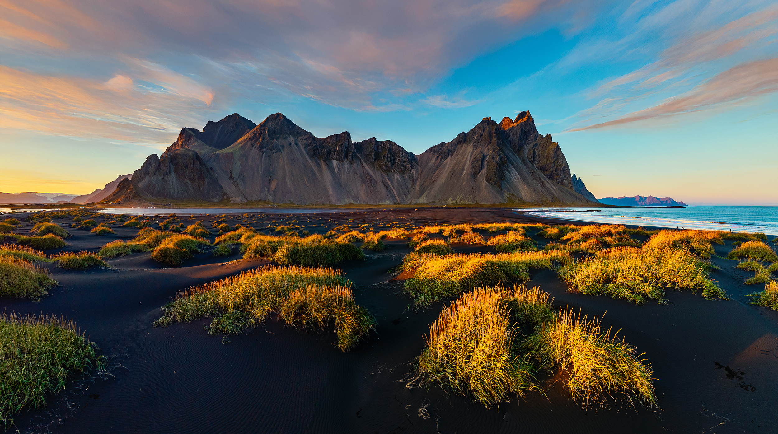 落日的最后一抹光斜斜洒落,点亮了蝙蝠山棱角分明的山尖,照亮黑沙滩上的黄金草翻涌着金色波浪。大疆Air3S摄影,15张包围曝光+接片。飞侠行摄冰岛[超话]