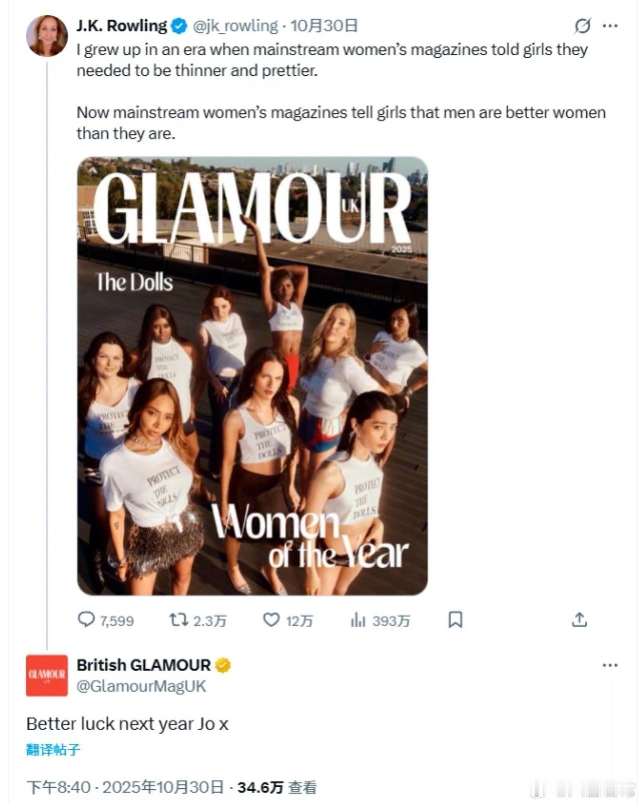 《Glamour》回应J.K.罗琳:那祝你明年好运吧,Jo x
