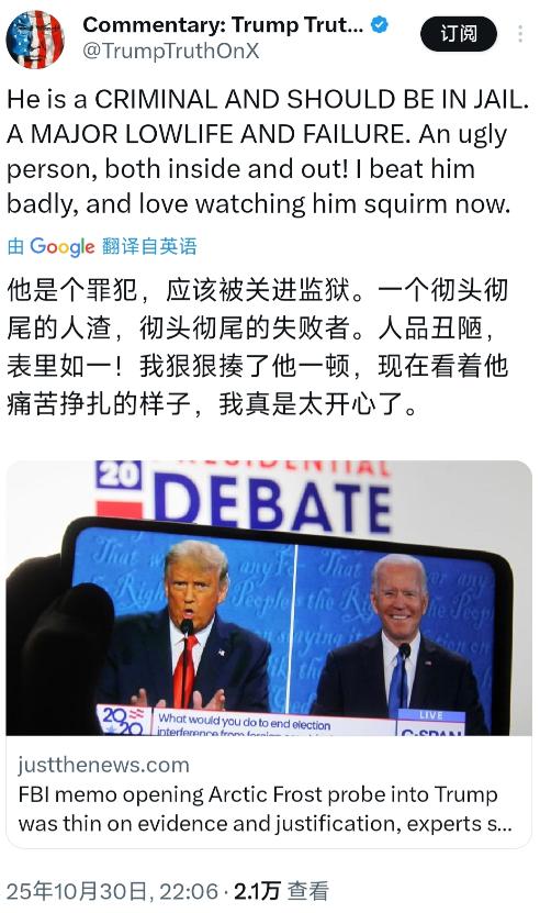 特朗普再次抨击拜登。特朗普10月30日发文写道:“他是个罪犯,应该被关进监狱。一个彻头彻尾的人渣,彻头彻尾的失败者。人品丑陋,表里如一!我狠狠揍了他一顿,现在看着他痛苦挣扎的样子,我真是太开心了。” 特朗普在10月30日对拜登发起的猛烈抨击,绝非一次孤立的口水战。这场风波源于四天前拜登在一次与拉美裔人士的线上活动中发表的不当言论。 当时为回应此前一位喜剧演员将波多黎各形容为“漂浮的垃圾岛”的争议性言论,拜登情绪激动地反击特朗普,并表示“我看到唯一漂浮的垃圾就是他(特朗普)的支持者”。这句话立刻被特朗普团队紧紧抓住并放大解读。 特朗普迅速将拜登的言论定性为“对全体特朗普支持者的侮辱”。他擅长将政治攻击转化为极具视觉冲击力的舆论事件。 当地时间10月30日晚,在威斯康星州的集会上,特朗普别出心裁地脱下他常穿的深色西装,换上一件美国清洁工常见的橙色反光背心,并登上一辆垃圾车现身。 他对着现场的支持者调侃道:“你们喜欢我的垃圾车吗?这辆车是用来向哈里斯和拜登致敬的。” 这种戏剧化的表演天赋让特朗普成功将舆论焦点从拜登对个别支持者的批评转移到了“民主党人藐视美国工薪阶层”的叙事上。 面对这场突如其来的风波,拜登团队不得不紧急灭火。白宫发言人试图从语法角度进行辩解,称拜登所指的其实是“一名支持者的”仇恨言论是“垃圾”,而非针对“所有支持者”。然而这样的解释在政治传播中显得苍白无力。 《纽约时报》对此评论道:“哈里斯的战略顾问们可能以为,让拜登总统待在白宫就可以避免问题。但现在他们可能还需要拿走他的Zoom密码。”该报指出,在这场势均力敌的选举最后阶段,任何微小的失误都可能产生决定性影响。 这场围绕“垃圾”一词的激烈交锋,只是拜登与特朗普之间长期互攻的一个缩影。实际上,特朗普对拜登的攻击涵盖多个层面。 他曾在集会上严厉指责拜登在上任后“扼杀了美国梦”,并宣称“你可以把美国历史上最糟糕的五位总统放在一起,他们都不会像拜登那样,在短短15个月内造成这么大的破坏”。 特朗普还将拜登称为“一场接一场的列车事故”,并指责其因“在阿富汗的羞辱性投降”和“40多年来最高的通货膨胀”让美国“蒙羞”。 甚至在今年,特朗普还曾围绕宗教信仰对拜登发起攻击,声称拜登“伤害了《圣经》,伤害了上帝。他反对上帝,反对枪支,反对能源”。 而拜登竞选团队则立即反击,指责特朗普“亵渎《圣经》”,并强调拜登的信仰是其核心,称他“一生都过着有尊严的生活,在极度艰难时期,这是他的力量和安慰的源泉”。 两人之间的相互抨击早已超出一般政策辩论的范畴,演变成一场涉及个人品格、宗教信仰和民主价值的全面对抗。《纽约时报》曾将这场可能的“二次对决”形容为“一场关乎民主未来的灾难性争斗”。 值得注意的是不少美国选民对这两位候选人都并不满意。美国广播公司新闻部和益普索联合进行的一项最新民调显示,有约三分之一的美国人不相信这二者中的任何一人能将国家治理得更好。这种普遍的失望情绪反映出政治精英与普通民众之间的深刻撕裂。 正如美国马里兰大学国际和安全研究中心研究员克莱·拉姆齐所说,拜登和特朗普的再次对决将使人们越发感到,美国政治体系不是为普通民众服务的。 特朗普在10月30日的激烈言论并非孤立事件,而是这场高度两极分化的选战中相互攻击不断升级的必然表现。类似的语言交锋会更加频繁和激烈,这不仅考验着两位主要候选人的政治智慧,也将进一步考验美国民主制度的韧性和美国社会的团结。在这场近乎零和游戏的权力斗争中,双方都已投入全部政治生命,而最终结果必将对未来多年美国政治走向产生深远影响。