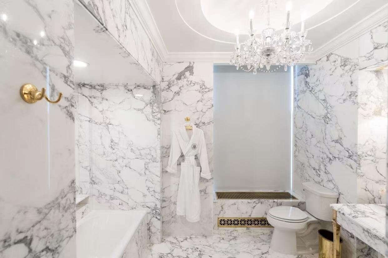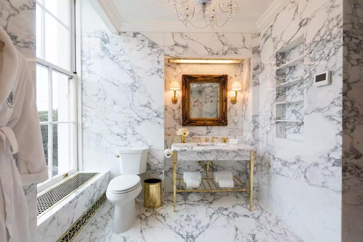 我翻新了白宫的林肯浴室。它在1940年代曾以绿色装饰艺术风格瓷砖进行过翻新,但这与林肯时代完全不符。我将其改为黑白抛光的雕像级大理石。这种风格非常符合亚伯拉罕·林肯时代,实际上,很可能就是当年原本的那块大理石!