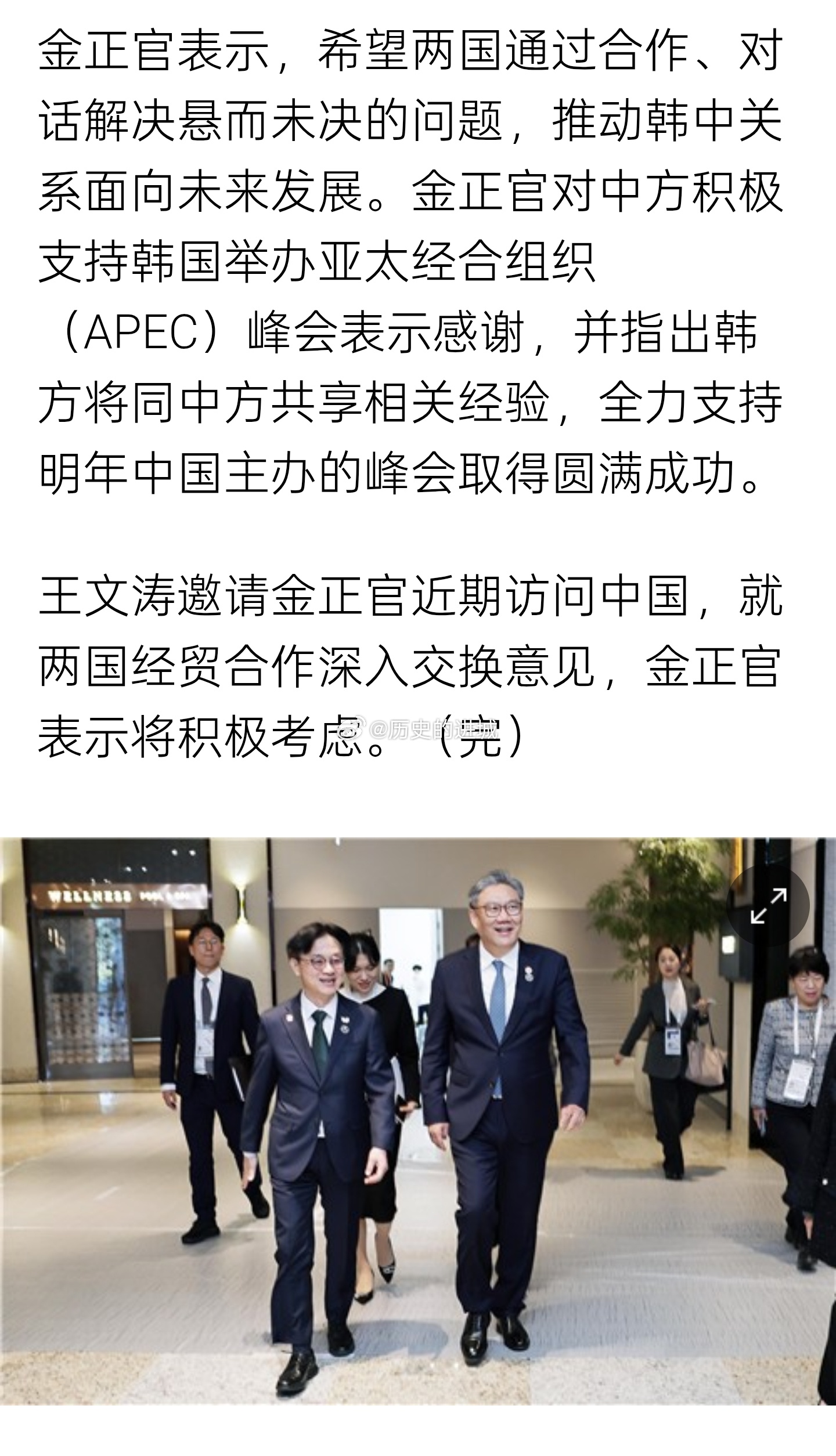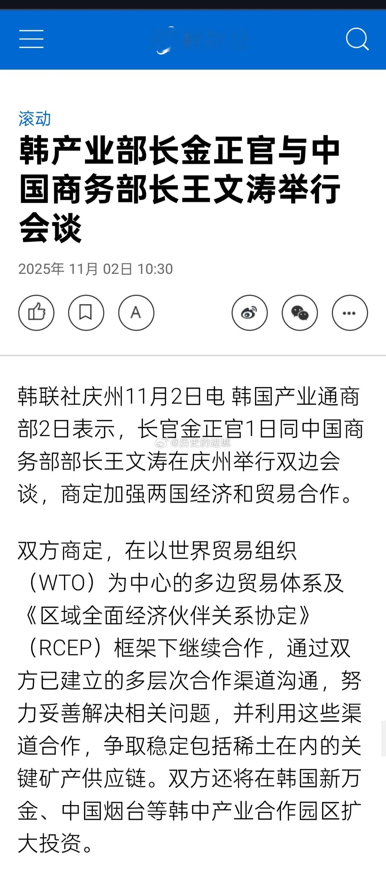 韩国产业通商部长金正官1日同中国商务部部长王文涛在庆州举行双边会谈,商定加强两国经济和贸易合作。双方商定,在以世界贸易组织(WTO)为中心的多边贸易体系及《区域全面经济伙伴关系协定》(RCEP)框架下继续合作,通过双方已建立的多层次合作渠道沟通,努力妥善解决相关问题,并利用这些渠道合作,争取稳定包括稀土在内的关键矿产供应链。双方还将在韩国新万金、中国烟台等韩中产业合作园区扩大投资。