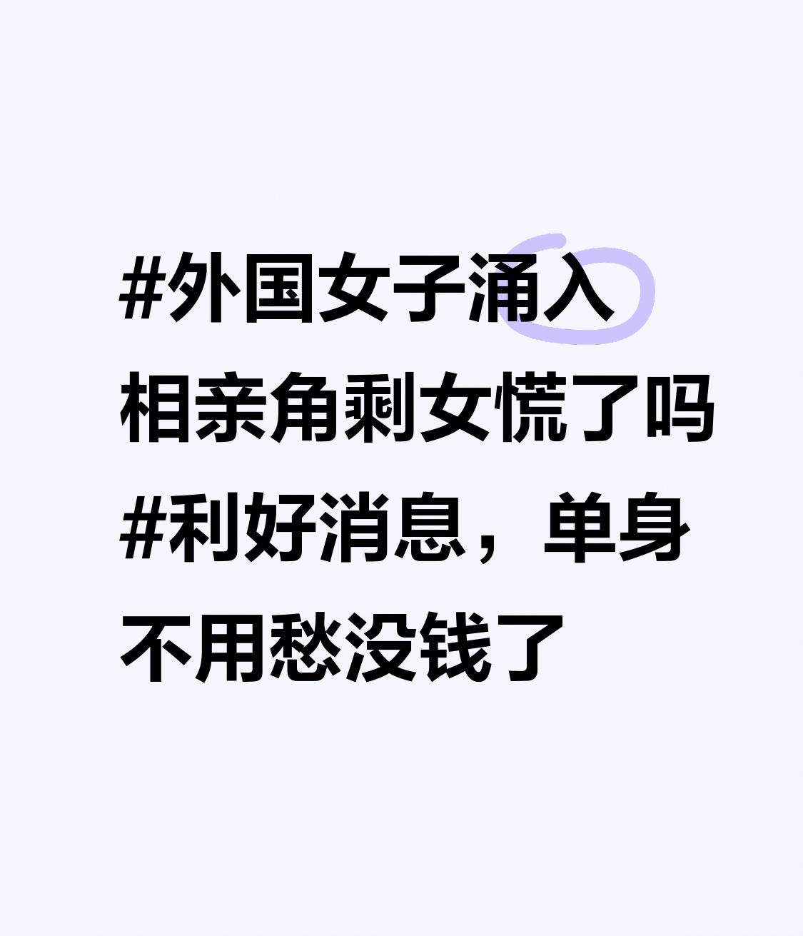 现在相亲市场可太有意思了。相亲角里留资料的女性居多,之前某大城市相亲角都暂停女性登记,欢迎男性了。上海登记征婚男女比例达到1:9。以往男光棍多,现在大龄剩女一抓一大把。 不过外国女子涌入相亲角,对单身的人来说或许真是利好。以前剩女愁嫁,要么是自身能力强择偶标准高,要么是网络骗彩礼现象让男生恐婚,还有年轻人不想承担家庭责任。现在有了外国女子加入,竞争格局变了,单身的人脱单机会增加,也不用愁没钱娶不到老婆啦。