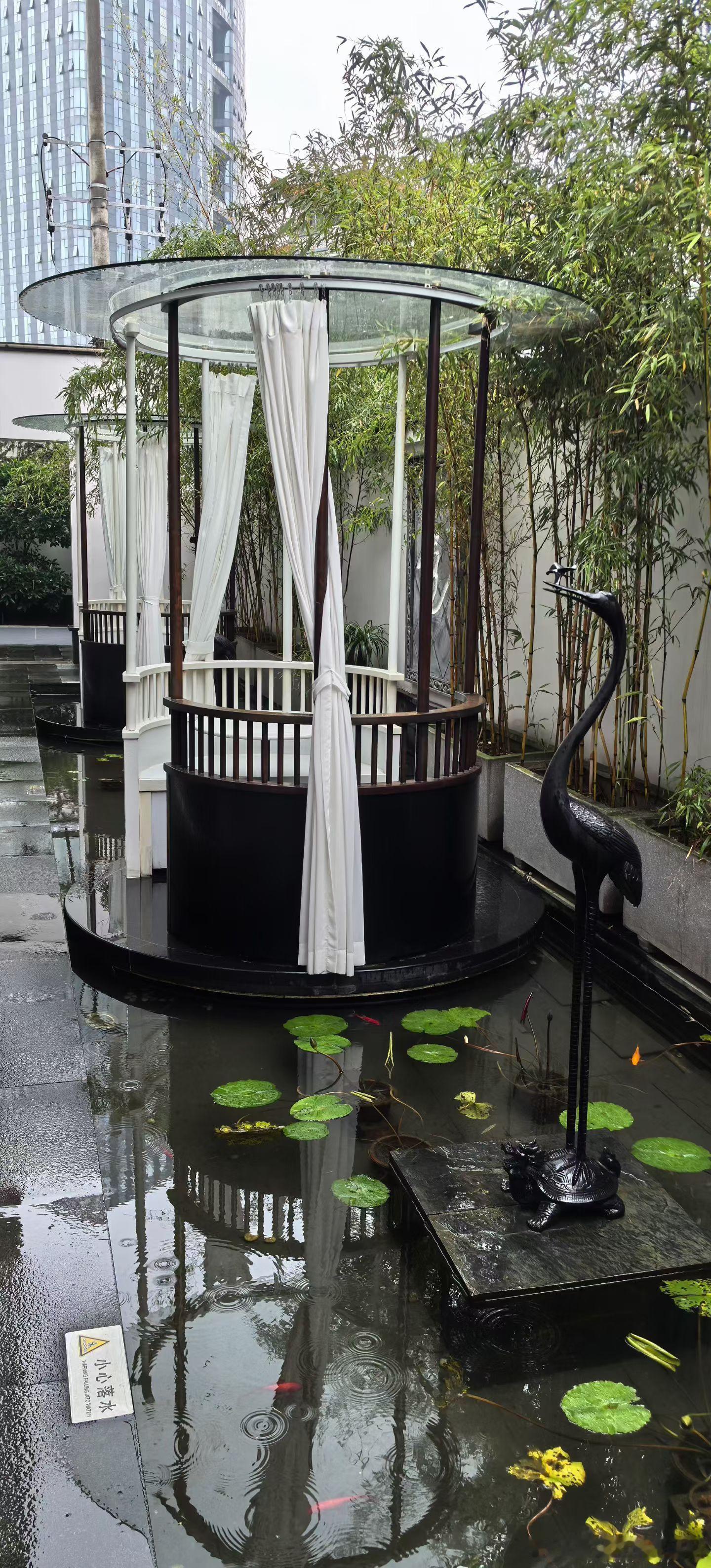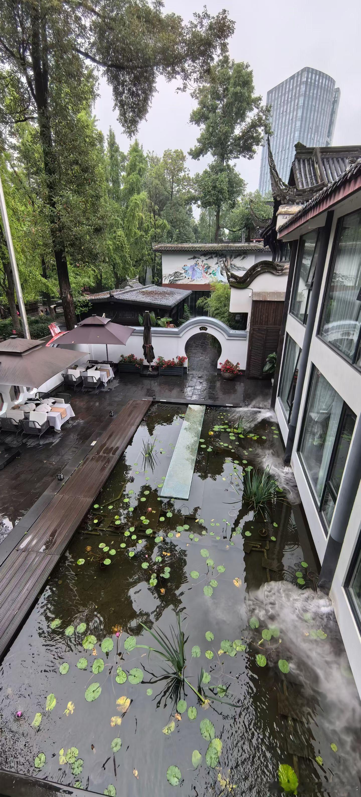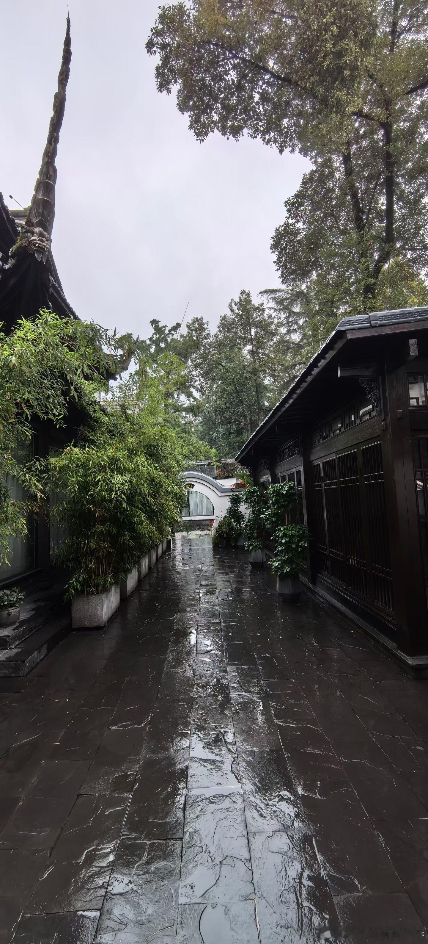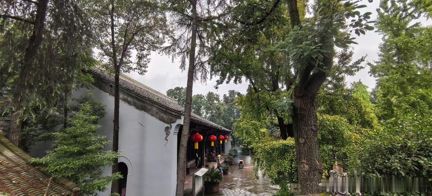 我住在与青羊宫道观一墙之隔的小院,站在露台上,就能望见观内红灯笼高悬,烟雾袅袅。每天凌晨五点,道观的钟声总会准时响起,那是道众上课的信号,总觉得他们格外辛苦,要这般早起身。钟声一落,我也没了睡意,索性起身在院里转悠。雨丝轻洒下的小院,景致格外动人。