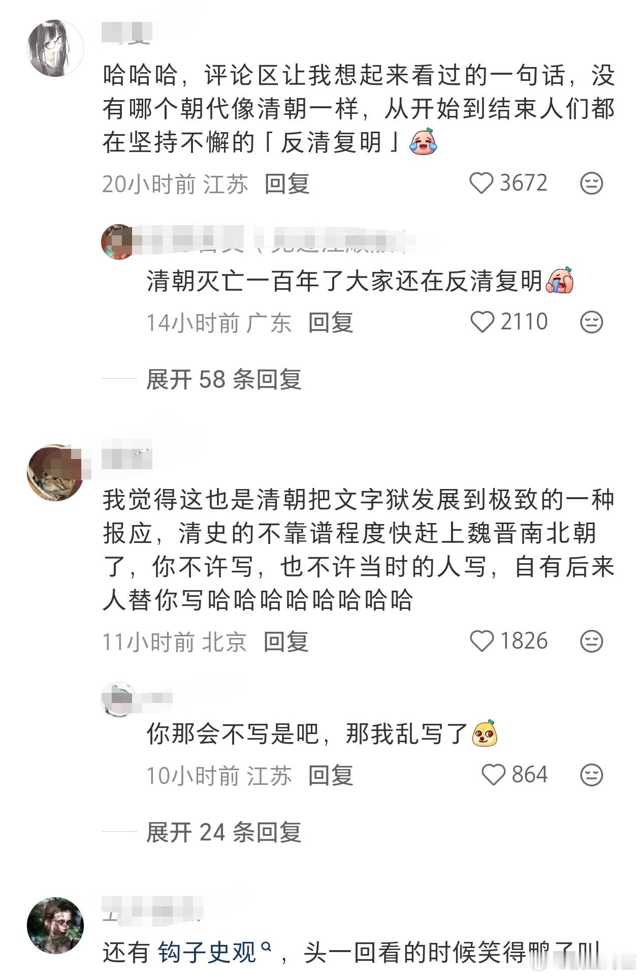 互联网最近发明的洪康熙和近几年很火的癸酉版红楼梦都是非常的结构历史,而且评论区说的还真是……很少有朝代像清朝这样,从开始到它结束一百多年了一直都持续的被普罗大众“反清复明”,甚至大家未必多爱明朝,只是单纯讨厌清朝[泪奔]