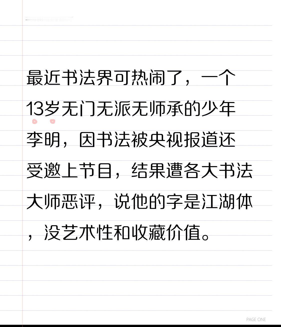 最近书法界可热闹了,一个13岁无门无派无师承的少年李明,因书法被央视报道还受邀上节目,结果遭各大书法大师恶评,说他的字是江湖体,没艺术性和收藏价值。 网友看法不一,有人说大师是嫉妒小孩书法热度高,还有人喷大师写的是乱书。其实李明书法流量大,一是字写得超过多数非专业人,二是他年仅13岁,少年有成很吸睛。有些大师批评得委婉,说不符合法度;有些却直接开骂,实在有失风范。这不禁让人感慨,现在艺术是不是被一些人玩坏了呢?