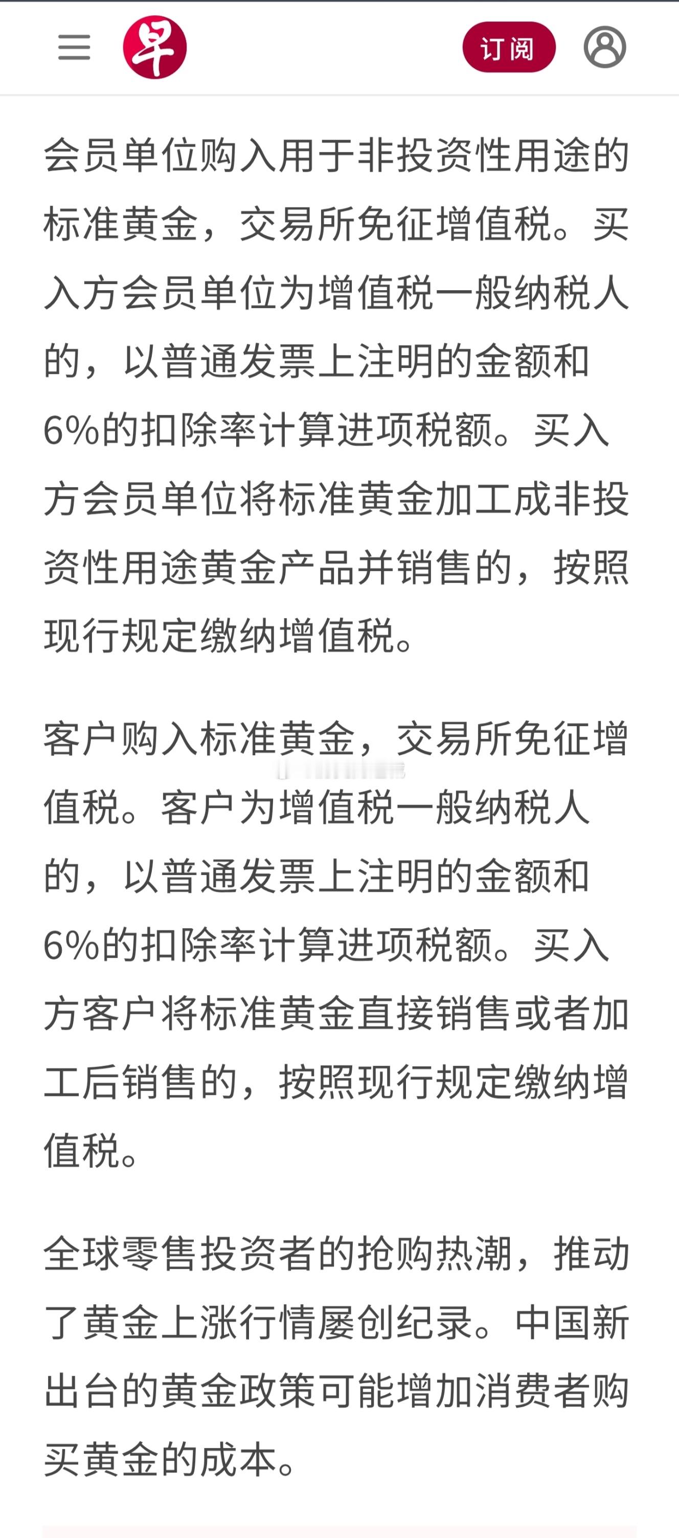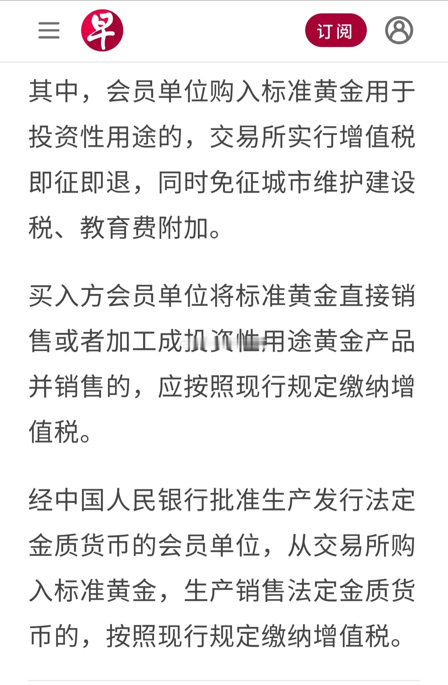 公告说,会员单位或客户通过上海黄金交易所、上海期货交易所交易标准黄金,卖出方会员单位或客户销售标准黄金时,免征增值税。未发生实物交割出库的,交易所免征增值税;发生实物交割出库的,按照规定适用增值税政策。