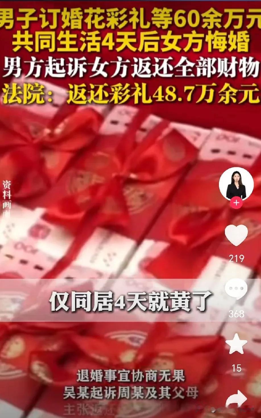 江西抚州,一男子订婚给女方彩礼,加上金条一共花了60多万元,没想到两人仅同居了4天,女方就悔婚,男子没办法就和女方商议退婚,不料女方却只想退一半彩礼,男子只好将对方告上了法院,最终法院这样判了! 涉事的男方吴先生是抚州金溪县人,38岁的他被家里催婚催得几乎喘不过气,经媒人介绍才认识了周女士。双方没来得及深入相处,就在两家催促下敲定了婚事。 这笔60多万的开销对吴先生来说绝非易事,他掏空多年积蓄不够,又东拼西凑借了外债才凑齐——其中包含38.8万现金彩礼、6万见面礼、给女方亲属的5.7万“打送钱”,还有价值7.32万的金条和金戒指,每一笔都沉甸甸压在他心上。 彩礼刚送出去不到两个月,4月25号周女士到宁波与吴先生同居,矛盾的爆发来得猝不及防。才4天时间,两人就吵到不可开交,周女士收拾东西回了老家,明确提出退婚。 她给出的理由很直接:吴先生隐瞒了真实收入,明明说月入一万多,实际只有7000元,还藏着外债;更让她无法接受的是,准公公竟提出让她拿彩礼钱开店。 吴先生的委屈可想而知,他当初凑钱全是“奔着结婚去的”,如今婚事告吹,自然要求全额返还60多万。 可周女士态度坚决,只认38.8万是彩礼,声称其他都是人情往来,最多只退一半,大概20万。双方争执不下,协商彻底崩盘,吴先生只能一纸诉状将周女士一家告上法庭。 法院审理时首先厘清了关键问题:哪些钱算彩礼?根据2024年2月施行的《最高人民法院关于审理涉彩礼纠纷案件适用法律若干问题的规定》,彩礼得结合给付目的、当地习俗和财物价值来认定。 最终法院核账后剔除了4万过节费和媒人钱、1.7万习俗“打发钱”,还有两人同居4天花费的5000元,确认54万余元属于“以结婚为目的的彩礼”。 判决返还比例时,法官综合考量了多重因素:双方未办理结婚登记,婚约目的没实现,这是支持返还的核心依据;但毕竟有4天共同生活经历,女方存在一定付出,不宜全额返还; 周女士主动悔婚,且未能证明彩礼用于共同支出,过错更明显。多重因素叠加,才有了“返还90%”的结果,也就是48.7万元。 让人意外的是,周女士一家不服判决,坚持认为吴先生隐瞒情况才导致分手,责任在男方,迟迟不愿履行。 更棘手的是,周家称彩礼已用于还债和装修自建房,账户里只剩5万,而自建房无法变卖,法院只能冻结银行卡、扣下部分金饰,执行过程异常缓慢。吴先生无奈之下,不仅打算申请将对方列为失信人员,还想追究媒人的责任。 这个案例戳中了当下彩礼纠纷的痛点。表面看是“4天损失12万”的数字争议,本质是高价彩礼对婚姻的绑架。 抚州近年一直在推进婚俗改革,倡导低彩礼、零彩礼,去年就有1200多名新人响应新风尚,有的“零彩礼”新人用积蓄创业年收入超30万。可吴先生的遭遇说明,陋习的根除并非易事,仍有人被“彩礼越高越有诚意”的观念裹挟。 法官事后的提醒很实在:给彩礼别用现金,转账务必备注“彩礼”;金饰发票要妥善留存;婚前更该坦诚收入、外债等关键信息。这些细节能在纠纷发生时减少举证困难,可比起事后补救,更重要的是让彩礼回归“心意”本质,而非变成捆绑婚姻的交易筹码。 彩礼纠纷的解决,从来不止于法院的一纸判决。如何让“低彩礼”真正成为共识,如何破解判决后的执行难题,才是对婚俗文明的真正考验。 各位读者你们怎么看?欢迎在评论区讨论。