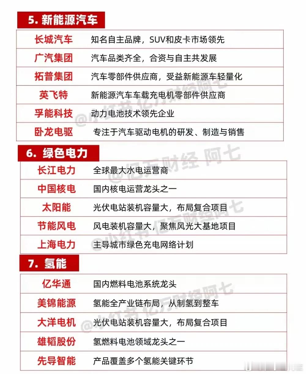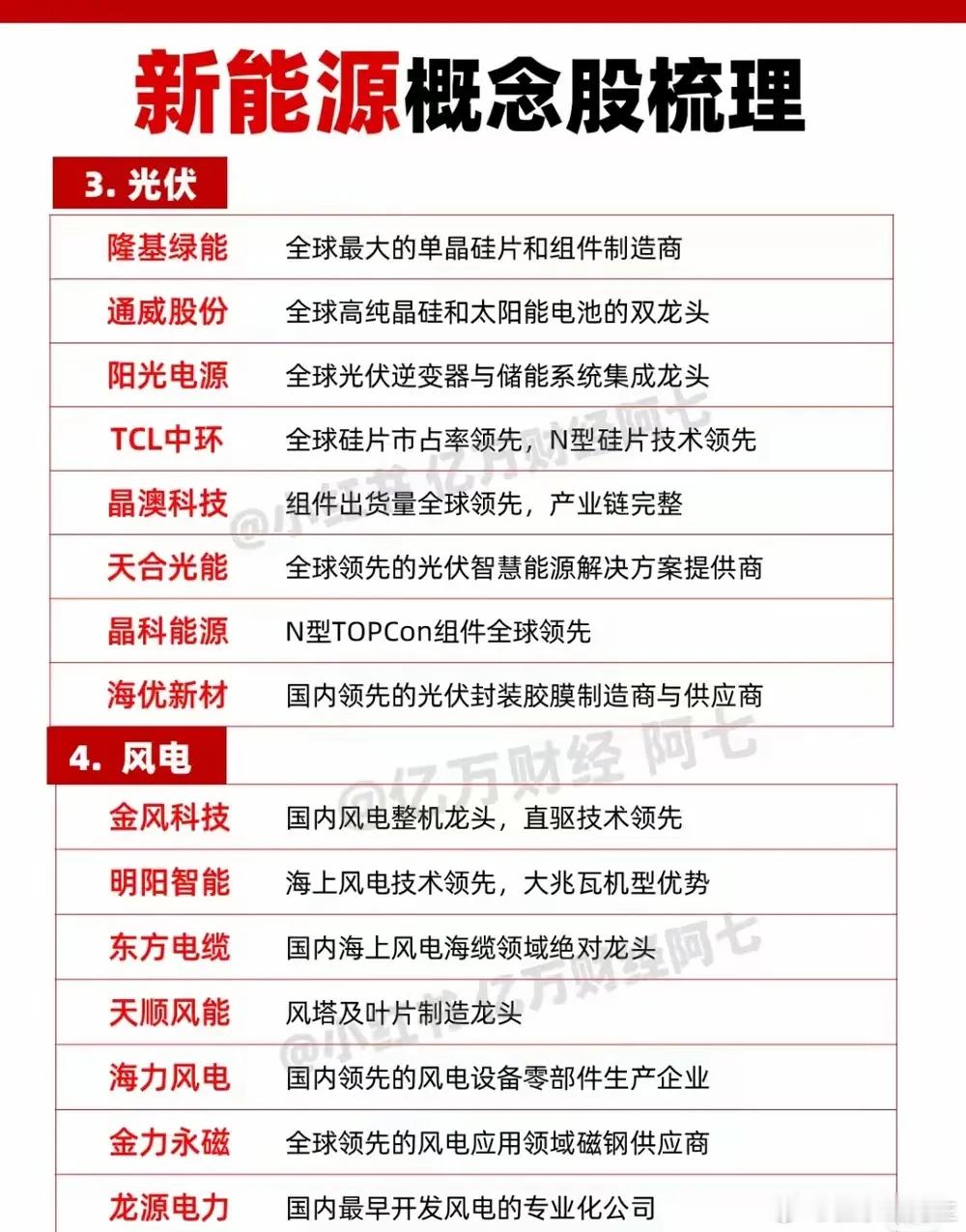 “新能源概念股梳理”图表,按照新能源的主要细分领域,系统地整理了相关核心企业及其行业地位与业务亮点,涵盖锂电池、储能、光伏、风电、新能源汽车、绿色电力、氢能七大方向,为了解新能源产业链及投资标的提供了清晰的参考。下面是各部分的总结:股票今日看盘股票[超话]