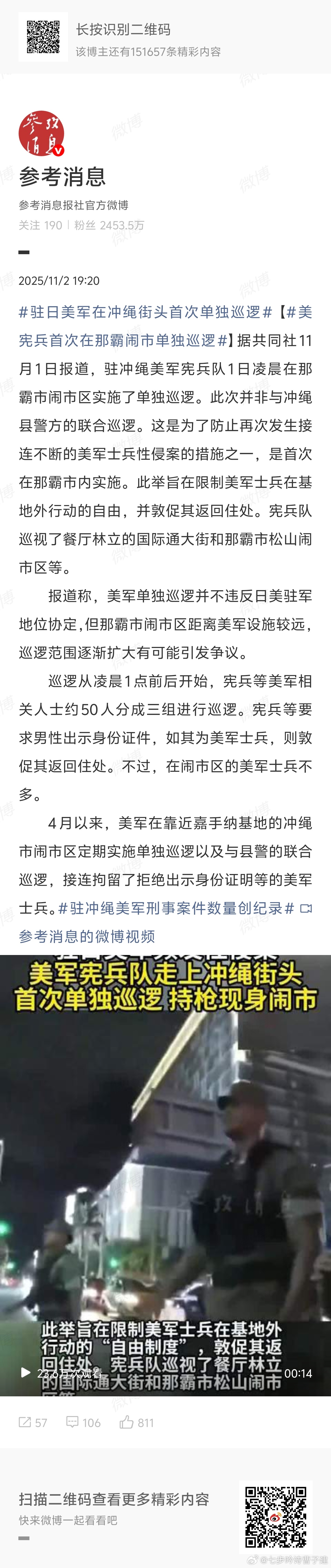 驻日美军在冲绳街头首次单独巡逻自己查自己?