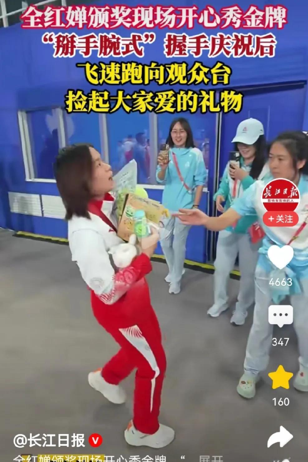 发现婵宝太“幼稚”了!在领奖之前,婵宝一个动作让我很不习惯。 她在台下表情严肃,还狠大家挥着手,感觉她已经变了,故作正经,一点也不可爱。 可下一秒,她忍不住笑了起来,还捂着嘴。 原来,婵宝没有变,她在成长,想让自己变的成熟稳重,可自己越是故意装做成熟,自己越是觉得好笑。 看,她又在甩头发了,为什么?因为婵宝开始适应长发飘飘了,这也是婵宝长大的表现呀! 但她又忍不住喜欢那些玩偶,每次赛事,婵宝粉丝们都会给她带可爱的玩具,婵宝不忍心拒绝,照单全收。 其实,她不是给自己玩的,因为她没有太多玩耍的时间,她是搜集起来,送给福利院的小朋友的。 他们不能感受正常孩子童年的幸福,那么就让这些玩具陪着他们吧! 她长大了,长高了,也变的爱美了,也想变成自己心目中成熟的大人。 可是,无论怎样,她依然是大家心目中那个可爱的婵宝,不是因为她能得冠军,而是她的单纯、善良、刻苦、可爱、聪明。 无论她是不是冠军,有没有胖成球,她都是我们心目中那个可爱的婵宝!大家说是不是?全红婵 冠军婵宝