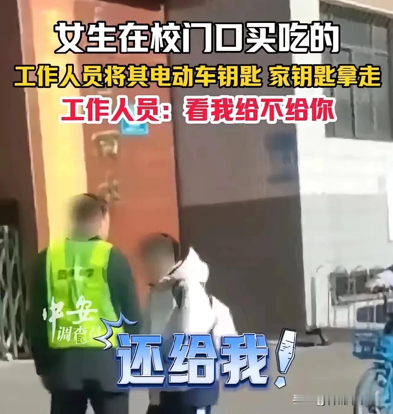 “好大的官威啊!”山西大同,女生在校门口买吃的,工作人员将其电动车钥匙拿走!女生哭着求工作人员还给自己,工作人员却说:“看我给不给你……” 网友:学校的工作人员,有抢夺学生财物的权力了吗? 被拿走钥匙的女生叫李娜,是大同某高校的学生,家在周边的云州区,父母都是种地的,每月给她1500块生活费。 这辆电动车是她去年暑假在餐馆端盘子、发传单攒了两个月钱买的,花了3800块,主要是为了周末能回家帮父母干农活,平时没课还能骑去市区做家教补贴开支。对她来说,这车不只是代步工具,更是能减轻家里负担的“帮手”。 事发那天是周三下午,李娜没课,想着去校门口的小吃摊买个杂粮煎饼当晚餐,然后赶去家教的地方。校门口靠近公交站,平时总有些学生临时停车买东西,她之前也停过几次,没见有人管。 那天她刚把车停在路边,还没来得及拔钥匙,一个穿灰色制服、挂着“校园秩序维护”牌子的中年男人就走了过来,伸手就把钥匙拔了下来,往口袋里一揣,转身就要往学校里走。 李娜慌了,赶紧追上去,声音都有点发颤:“叔叔,我就买个饼,一两分钟就走,您把钥匙还给我吧,我等下还要去家教呢。” 那工作人员没回头,脚步也没停。李娜急得快哭了,拽了拽他的袖子,又重复了一遍,对方才停下,斜着眼睛看她,语气特别冲:“校门口不让停车不知道吗?现在知道求了?早干嘛去了?看我给不给你……” 周围几个买东西的学生和商贩都看了过来,李娜脸涨得通红,眼泪忍不住掉了下来——她怕钥匙要不回来,没法家教就没收入,更怕电动车丢了,再买一辆根本凑不出钱。 有路过的学生把这一幕拍了下来,发到了学校的表白墙,没半天就火了。 评论里吵翻了,有人说校门口确实该管秩序,但工作人员也不能直接抢钥匙,至少得先提醒;有人说见过这个工作人员,之前也跟学生起过冲突,说话总是带着“命令”的口气; 还有学生晒出校门口的照片,说路边没看到“禁止临时停车”的牌子,就算有规定,也该好好沟通,不是用这种“拿捏人”的态度。 更让网友在意的是“看我给不给你”这句话——这话里的傲慢太明显了。 学校的工作人员,本质是为学生服务的,就算学生有违规行为,首先该做的是告知规定、劝导改正,而不是用“扣钥匙”的方式拿捏人,甚至说出带有挑衅意味的话。 李娜后来在评论区补充,她当天跟工作人员耗了快20分钟,直到有老师路过问清楚情况,让工作人员把钥匙还了回来,可她还是错过了家教的时间,跟家长解释了半天,对方才没取消订单。 事情发酵后,学校第二天在官微上发了说明,说涉事工作人员是外包的校园安保公司人员,当天是按照“校园周边交通秩序整治”的要求执勤,但存在“处置方式简单、态度生硬”的问题,已经让安保公司对他进行批评教育,还让他给李娜道了歉。 同时也提醒学生,校门口主干道禁止临时停车,后续会增设明显标识,安排人员提前劝导,避免再发生类似情况。 可网友并不完全买账——很多人问,外包人员就能有“扣钥匙”的权力吗?就算有整治要求,是不是该先培训清楚处置流程?更有人说,比起道歉和加标识,更该改的是工作人员的“官威”心态。 学生不是需要被“管控”的对象,而是需要被尊重的个体,哪怕是维护秩序,也得守住“待人友善”的底线,不然再严的规定,也只会让学生反感。 其实这事说大不大,说小不小。它暴露的不只是一个工作人员的态度问题,更是部分校园管理中“重管控、轻服务”的倾向。 学校的秩序需要维护,但维护的前提是理解学生的实际需求——李娜临时停车是为了赶时间,不是故意违规;工作人员的职责是引导,不是“刁难”。 如果双方都能多一点体谅,一句“同学,这里不让停车,麻烦尽快开走”,可能就不会有后面的争执和委屈。 校园本该是最有人情味的地方,管理的温度比规定的硬度更重要。希望这次事件能让更多校园管理者明白,真正的秩序,不是靠“官威”维持的,而是靠互相尊重和理解搭建起来的。 各位读者你们怎么看?欢迎在评论区讨论。