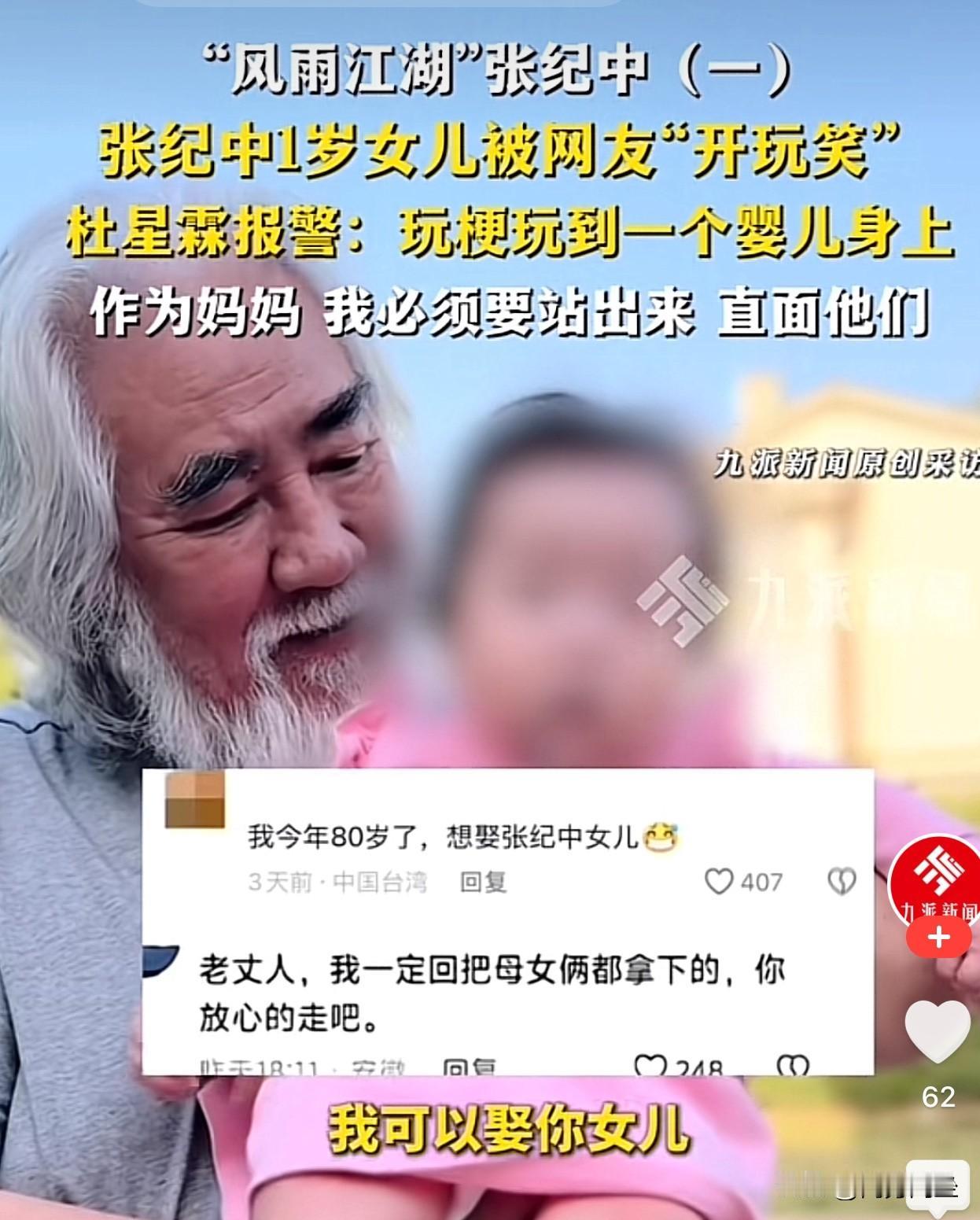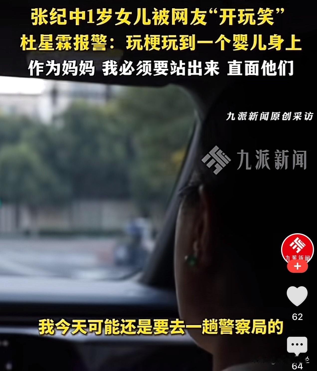 杜星霖报警,称用一岁婴儿的梗涉及黄谣,网友在评论区的言论是一种成年人之间的性侮辱,并非是“开玩笑”。 杜星霖称已经取证报警。 张纪中夫妇平时行事高调,一岁的女儿无辜被某些无德网友做文章,这些恶意的评论,背后表达的是对张纪中夫妇言行的不满,主观上并非是去攻击一岁的婴儿。 杜星霖在反击网友时,由于情绪激动,口不择言,没想到祸从口出,在她的嘴里同样祸及到了网友无辜的父母。 古话说,祸不及子孙父母,罪不及妻孥。 杜星霖报警后,这案情该怎么判? 或许各打五十大板。