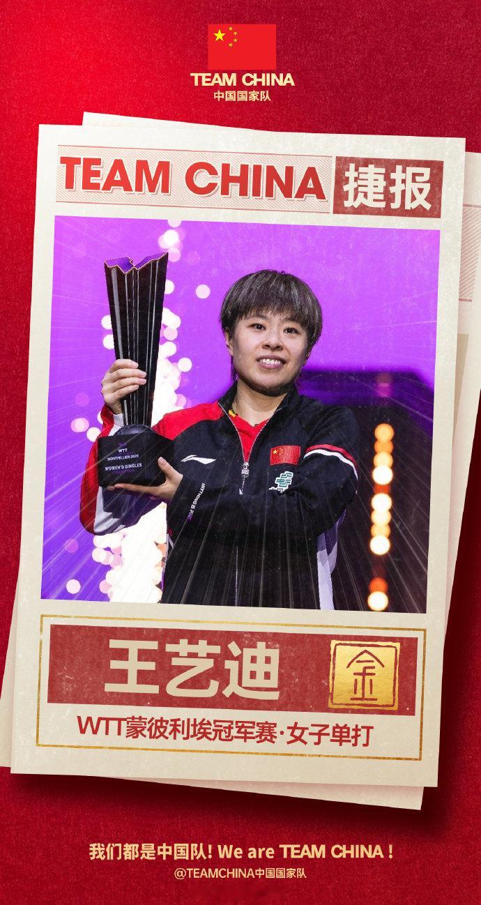 【中国国家队恭喜王艺迪夺冠】中国国家队发捷报恭喜王艺迪11月3日,王艺迪获得蒙彼利埃冠军赛女单冠军,发文恭喜王艺迪:信念为球拍,挥汗之处,即是舞台。恭喜获得WTT蒙彼利埃冠军赛女子单打冠军!