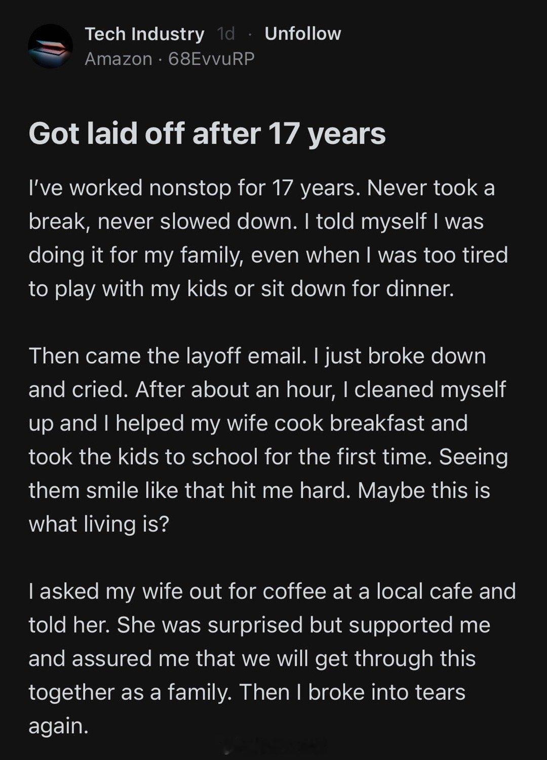 然后裁员邮件来了。我彻底崩溃,哭了。 一个小时后,我收拾好自己,帮妻子做早餐, 第一次送孩子们上学。看到他们笑得那么开心,真的很震撼我。 也许,这才是生活?