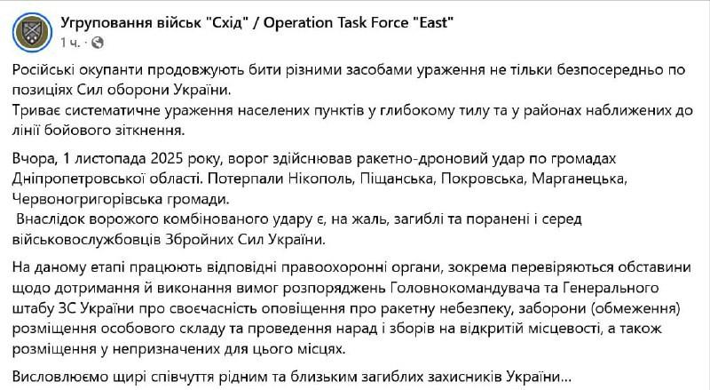 11月2日,乌克兰武装部队“东部”集群司令部发表声明称,俄罗斯军队对第聂伯罗彼得罗夫斯克州的乌克兰兵力集结地实施了联合打击。 根据当天的战场通报,第聂伯罗彼得罗夫斯克州已经出现 4 人死亡,其中还包括 11 岁和 14 岁的两名男孩,另有十人受伤,几人伤势严重,这还只是公开的初步数据,考虑到是兵力集结地遇袭,实际伤亡恐怕只会更多。 最耐人寻味的是声明里暗示的 “开阔地带部署兵力”,这简直是在俄乌战场里踩了最显眼的雷区。早在 2024 年 8 月的库尔斯克战役里,乌军就吃过一模一样的亏. 当时他们觉得库尔斯克地势平坦开阔,适合装甲部队展开,硬是把一万多精锐兵力拉到开阔地集结,结果被俄军的多层次监视网络抓了个正着,远程火箭炮先进行覆盖性轰击,战斗机和武装直升机接着补刀,最后五千五百名官兵当场伤亡,五百三十件重型装备炸成零件,连主战坦克都毁了七十一辆。 这次第聂伯罗彼得罗夫斯克州的乌军显然没吸取教训,要知道俄军现在的侦察手段早就今非昔比,“海鹰 - 10” 无人机天上拍,卫星地面盯,就算想在开阔地隐蔽,装甲车辆的红外信号和人员集结的热成像特征根本藏不住,等于把自己变成了活靶子。 再说说要调查的 “导弹危险预警” 问题,这事儿往难听了说,乌军的预警系统早就不是第一次掉链子。 2025 年 9 月基辅遭遇空袭时,俄军一下子放出 500 架无人机和 40 多枚导弹,乌军雷达瞬间捕捉到 643 个目标,直接乱成了一锅粥,爱国者导弹要么打空气要么失控坠落到居民区,连自家 F-16 战机都被误击过两次。 更要命的是俄军还专门玩起了电子战套路,先把 “磁场 - 21” 电子战系统推到前线,伪造 200 个弹道导弹信号,让乌军防空雷达的虚警率飙到 43%,操作手得靠猜来决定打哪个目标,等真正的 “匕首” 导弹飞过来时,雷达早就被干扰得 “失明” 了。 这次第聂伯罗彼得罗夫斯克州的打击,大概率也是这套流程,无人机先探路,电子战系统搞干扰,导弹跟着偷袭,预警系统就算想发信号,要么被干扰传不出去,要么真假目标分不清,等士兵听到爆炸声再躲根本来不及。 至于 “是否遵守禁止在开阔地带部署及非指定区域驻扎的规定”,这背后藏着的指挥问题比违规本身更要命。 乌军内部早就流传着总司令瑟尔斯基的 “微操” 笑话,他放着战略规划不管,非要越级给步兵小队下命令,连阵地设在哪儿都要管,还威胁 “不听话就坐牢”,科斯特扬季尼夫卡那片战略劣势地区,就是因为他坚持 “不放弃任何定居点”,逼着部队钉在那儿,最后丢了大片领土还赔上不少兵力。 这种指挥混乱到了前线,基层官兵要么机械执行命令,哪怕明知道开阔地危险也得去,要么干脆搞不清该听谁的,找个看着安全的非指定区域驻扎,结果正好撞上俄军的打击清单。 2025 年 8 月顿涅茨克州的沙别利基夫卡村就是例子,乌军第 156 旅明明该分散部署,却被硬凑在林地开阔地,被俄军无人机 + 导弹 + 轰炸机的组合拳直接打残,两个机械化营全没了,旅部都被炸平,剩余战力不足三成。 更关键的是,俄军现在的联合打击早就形成了成熟套路,根本不给犯错的乌军留活路。 先是 “沙赫德 - 136” 无人机低空突防,炸掉前沿雷达和防空点,同时回传坐标;接着 “伊斯坎德尔 - M” 导弹以 5 马赫速度砸向指挥中枢,先断指挥;然后苏 - 34投下 FAB 重型炸弹,把弹药库炸成连环爆炸现场;最后远程火箭炮封死退路,一套流程下来,就算是精锐部队也扛不住。 更别提俄军现在的武器产量根本不愁,FAB 炸弹产量翻倍,“伊斯坎德尔” 每月能造 50 枚,伊朗每月还送两千多架无人机,完全能靠火力饱和打击磨死对手。 而乌军的防空系统大多守着基辅这种大城市,前线旅级部队基本是 “防空真空”,想躲都没地方躲,只能被动挨炸。 这么一看,第聂伯罗彼得罗夫斯克州的这场打击,不过是把乌军预警滞后、指挥混乱、违规部署的老问题又集中暴露了一次,之前库尔斯克、沙别利基夫卡的教训还没吃透,新的伤亡又堆了上来,调查归调查,但只要这些根深蒂固的问题没解决,下次大概率还是换个地方重蹈覆辙。
