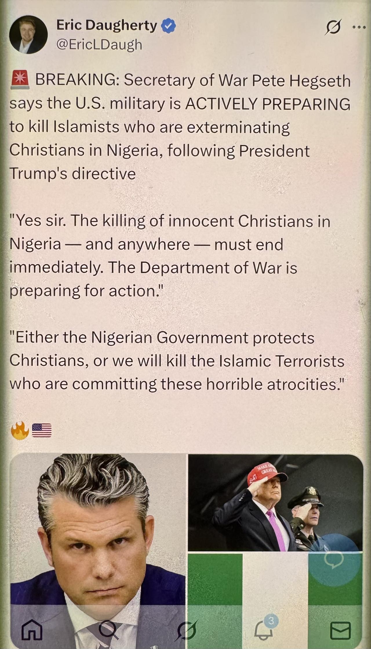 战争部长皮特·赫格塞斯表示,在特朗普总统的指示下,美国军方正在积极准备杀死在尼日利亚灭绝基督徒的伊斯兰主义者。 作为非洲人口最多的国家,尼日利亚2.3亿人口中基督徒与穆斯林各占相当比例,但东北部的极端组织早已将宗教作为施暴工具,其中“博科圣地”和其分支“伊斯兰国西非省”的暴行持续多年,如今仍在升级。 2024年10月27日,与尼日利亚接壤的乍得湖附近一座军事基地遭“博科圣地”袭击,40名士兵当场死亡,大量武器被劫掠,而仅仅半个月后的11月9日,该组织又在同一区域与乍得政府军交火,双方死伤过百,这些极端分子的嚣张气焰可见一斑。 更令人揪心的是,平民始终是暴力的主要受害者,联合国2025年6月的数据显示,尼日利亚东北部已有1060万人需要人道主义援助,他们中不少是因宗教迫害逃离家园的基督徒,村庄被烧毁、教堂被炸毁的场景在当地屡见不鲜。 尼日利亚政府虽然嘴上否认“纵容迫害”,声称宪法保障所有信仰公民的权益,但实际行动却难以让人信服。 这个非洲最大的石油生产国本应拥有足够的资源打击恐怖主义,可腐败问题早已蛀空了反恐根基,2006至2013年间,55名政府官员和前领导人盗用国家资产高达90亿美元,其中21亿美元本应用于购买武器对抗“博科圣地”,最终却成了竞选经费。 资金被挪用直接导致安全部队装备落后、响应迟缓,即便2016年启动了“安全走廊行动”进行去极端化教育,截至2025年也仅让881名前极端组织成员回归社会,相较于仍在活跃的恐怖分子数量,这点成效几乎杯水车薪。 更值得玩味的是,当地分析人士直言,尼日利亚的暴力事件虽有宗教因素,但政府长期未能平衡族群利益、化解资源争夺矛盾,使得极端组织有机可乘,而北部穆斯林占多数的地区,其实也是袭击的重灾区,只是基督徒群体的遭遇更易引发国际社会关注,这也从侧面说明尼日利亚政府的治理失责,没能保护好任何一个群体。 美国此时站出来表态,表面看是为无辜基督徒发声,实则背后藏着清晰的战略考量和现实基础。 作为全球反恐经验最丰富的国家之一,美国在打击极端组织上有着成熟的模式,从叙利亚到伊拉克,无人机空袭、特种部队渗透的“精准打击”早已轻车熟路,而非洲大陆6000多人的驻军和30个军事基地,为行动提供了硬件支撑。 即便2024年美国从尼日尔撤出了约1000名士兵,但其在东非吉布提的大型军事基地仍驻扎着5000多名士兵,完全有能力辐射西非地区。 更重要的是,尼日利亚的石油资源对美国有着不可替代的吸引力,作为非洲最大的石油生产国,这里的能源格局直接影响全球市场,美国自然不愿看到极端组织在这片战略要地持续作乱,更不想错过借反恐巩固地缘影响力的机会。 毕竟2024年以来,马里、布基纳法索等非洲国家纷纷转向俄罗斯合作,美国在萨赫勒地区的影响力受挫,此次以保护基督徒为名介入尼日利亚,既能重塑“正义形象”,又能重新找到西非军事存在的支点,这种一举两得的事,美国显然不会放过。 从国内政治来看,特朗普的表态也恰逢其时,美国一些共和党人士已施压数周,要求制裁尼日利亚,而将尼日利亚重新列为“特别关注国家”,迎合了国内基督教选民的期待,这对于争取选票有着直接作用。 要知道,尼日利亚曾在2020年特朗普首个任期内被列入该名单,后被拜登政府移出,如今重启这一标签,既是对共和党施压的回应,也是特朗普一贯“强硬外交”风格的体现。 而美国军方的快速响应,也展现了其在全球范围内调动资源的能力,战争部长强调的“快速、猛烈且干脆”的行动风格,并非虚言,美军在叙利亚打击IS时,仅空袭就摧毁了极端组织超过8亿美元的现金,无人机精准猎杀关键头目更是家常便饭,这样的作战能力,足以对尼日利亚的极端组织形成震慑。 当然,也不能忽略美国此次行动的道义基础,杀害无辜平民无论以何种名义都应遭到谴责,伊斯兰极端组织在尼日利亚针对基督徒的系统性暴力,早已突破了人道主义底线。 国际社会虽多次呼吁,但缺乏实际行动,美国的介入至少让极端分子感受到了切实的军事压力,也让受迫害的基督徒看到了希望。 尼日利亚总统府发言人表示欢迎美国协助打击叛乱分子,前提是尊重国家领土完整,这也为美国的行动提供了一定的合理性,毕竟在政府无力保护公民的情况下,外部力量的介入未必不是一种解决方案。 美国此次的准备行动,既是对恐怖暴行的回应,也是自身全球战略的调整,无论背后有多少复杂考量,能让杀害无辜基督徒的行为得到遏制,就是值得肯定的一步。 毕竟在极端暴力面前,任何拖延和纵容都只会让更多人陷入苦难,而美国凭借其军事和地缘优势,确实有能力成为制止这场人道主义危机的关键力量。