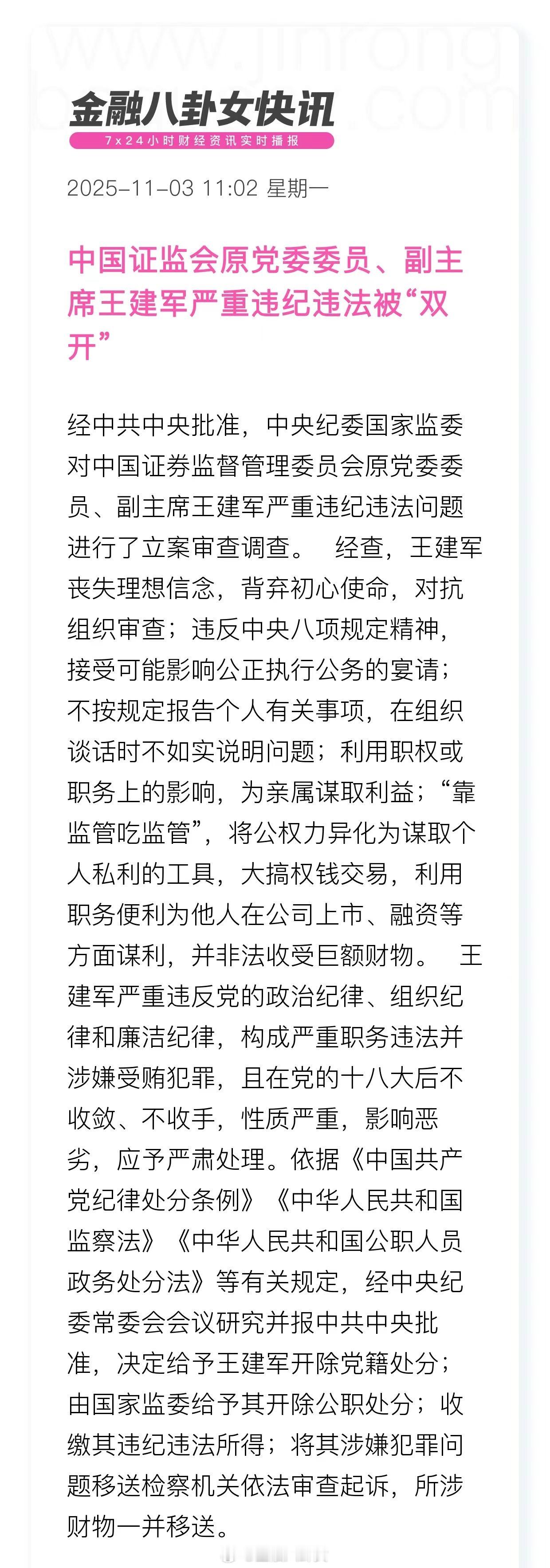 中国证监会原党委委员、副主席王建军严重违纪违法被“双开”