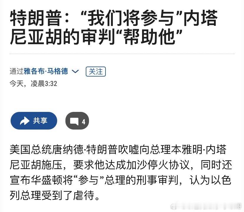 特朗普想干涉以色列内政么?内塔尼亚胡在战争前就面临三项贪腐和欺诈指控,如今这两年每周都要出庭受审,包括和商人有利益输送关系,禁止媒体报道等。海外新鲜事 特朗普认为这是反对派对Bibi的猎巫行动。