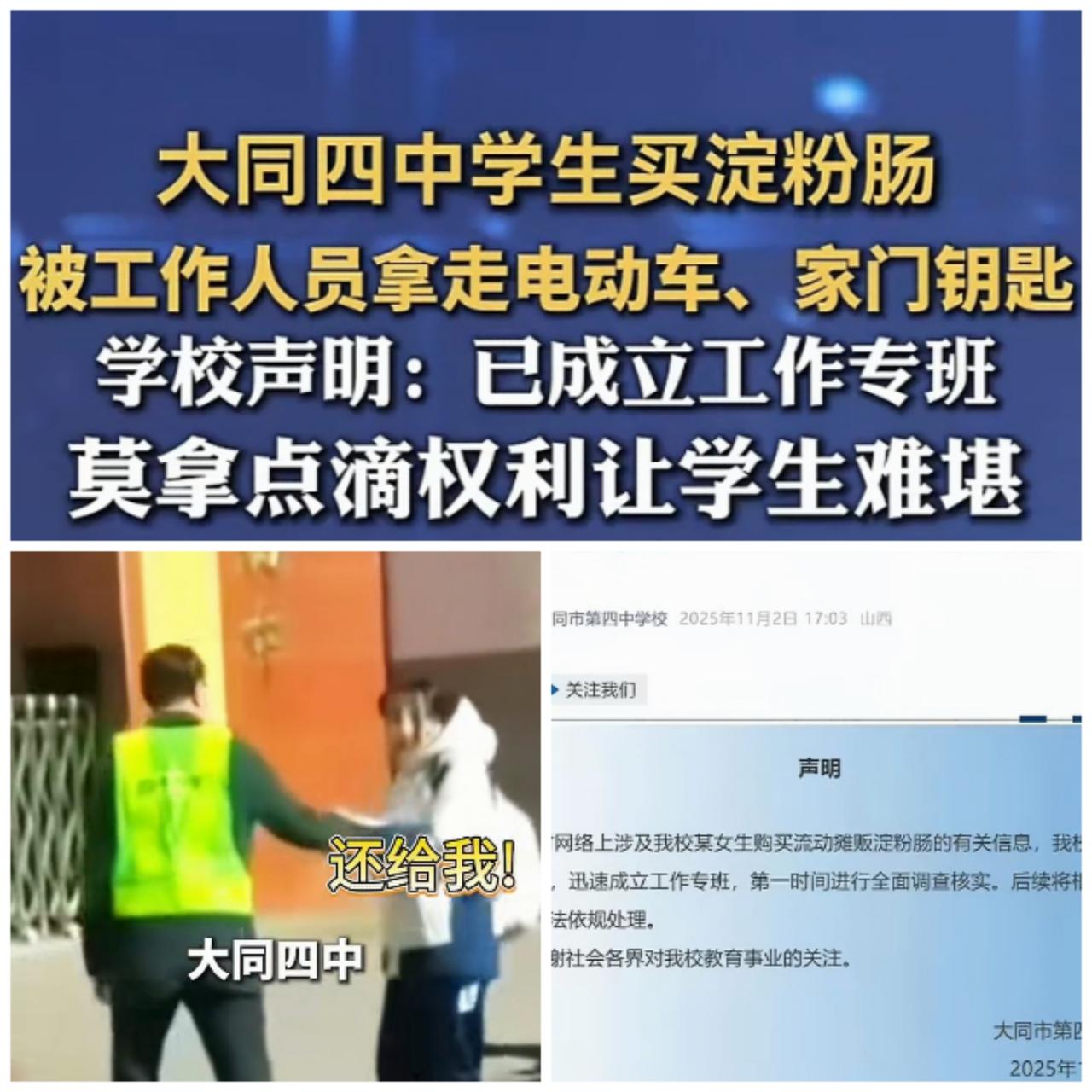 校门口“扣电车+家门钥匙式管理”赢麻了,不是管得严,也不知道怕学生吃坏肚子,而是拿权力拿捏孩子最省事! “就买根淀粉肠,钥匙凭啥归你管?”大同四中校门口,学生追着校工要钥匙的画面,把“赢麻了”的过度管理演活了。 说它赢麻了,真不是夸管得严——校门口摊贩该规范,但找城管、设劝导岗都是正路;也不知道是真怕学生吃坏肚子,毕竟扣钥匙和管食品安全半毛钱关系没有。 而是这种“扣钥匙”的操作,本质是拿权力走捷径:不用费口舌沟通,不用花精力协调,攥着孩子的电车+家门钥匙,就等于攥住了“听话密码”,既省事又能显“权威”。 可孩子的钥匙是回家的安全感,不是校工手里的“管理道具”。这种赢了“掌控感”,输了尊重的操作,赢再多也让人膈应!你遇过这种“懒政式管理”吗? 山西大同 大同四中收女生买肠钥匙合理吗