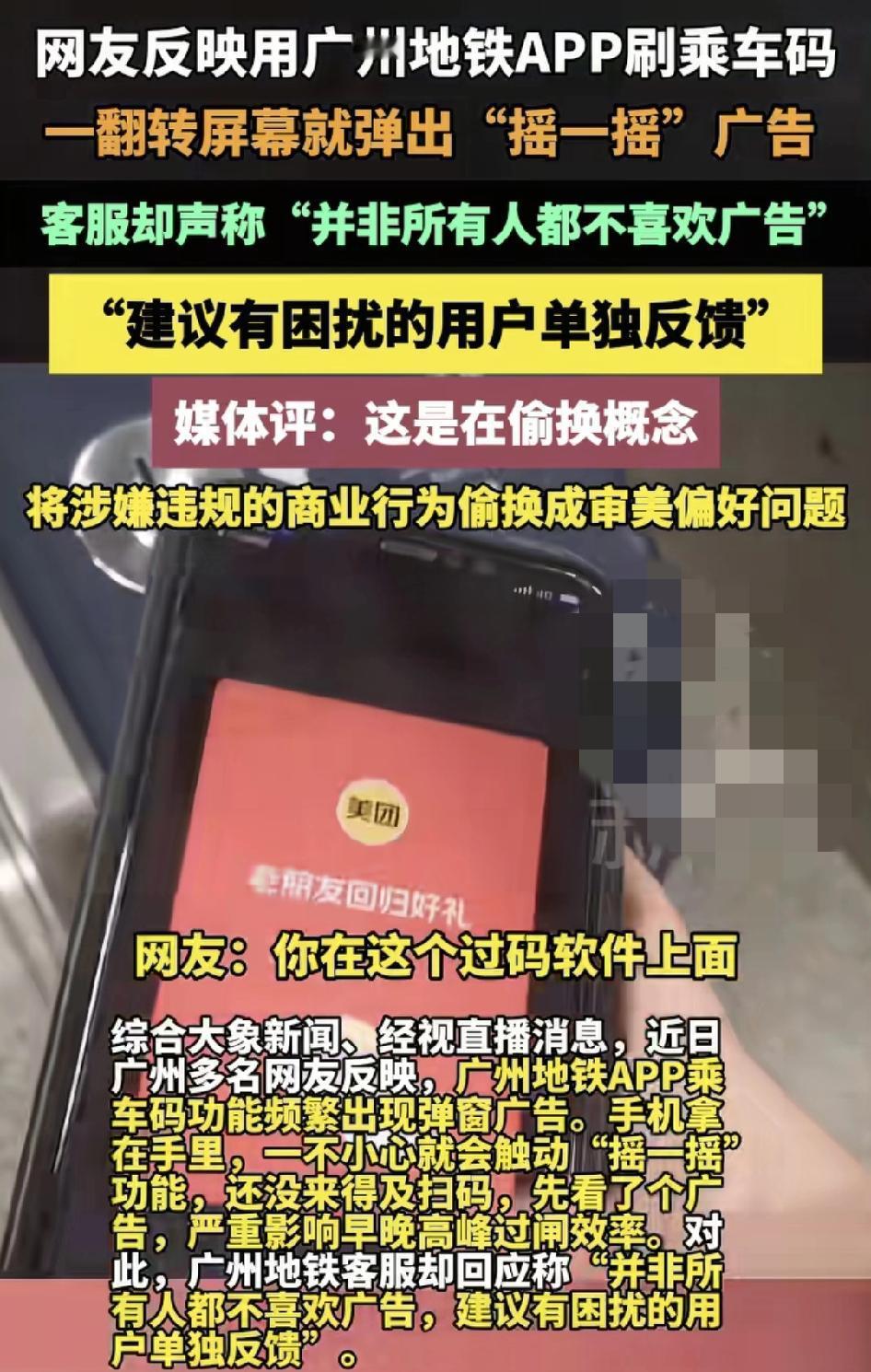 近日不少广州市民反映,早晚高峰期一乘坐地铁时用广州地铁app刷码时经常会弹出广告,还没来得及扫码,就要先看一小段广告,严重影响了通勤效率。更让人想不到的是像广州地铁反映情况,客服是这样回应的:并非是所有的人都不喜欢看广告,建议,这样的问题单独反馈。明明这些广告就占用了公共的资源,这需要企业是主动承担责任,反而把问题推向了小市民,让市民自己去解决问题,维权也更难了。