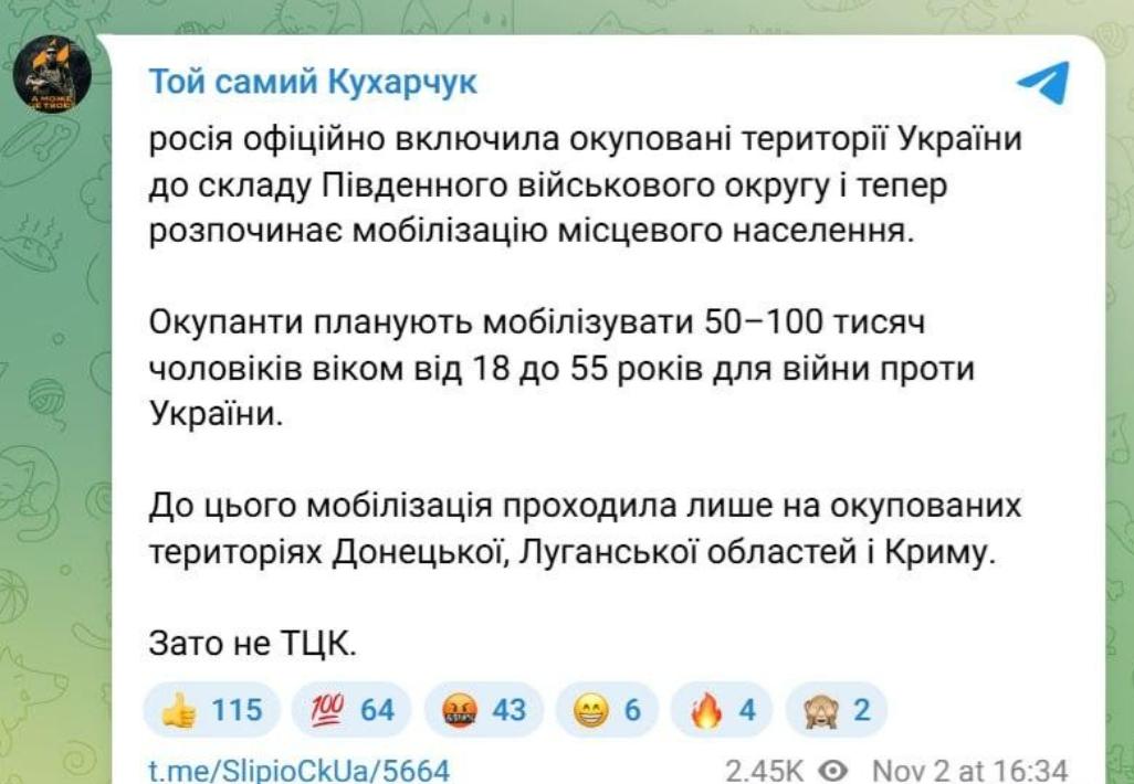 乌克兰第三集团军副司令德米特里·库哈尔丘克表示,俄罗斯已开始在乌克兰所有被占领土