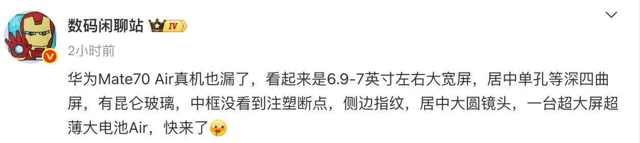 6.9英寸大屏?华为Mate70Air这么大啊! 网上看到的图片,据说是华为Mate70Air,这个月会发布,厚度在6毫米左右?6.9英寸左右的微曲屏幕,侧边指纹,电池可能在5000-6000之间,摄像头这么大,预计有红枫,拍照很强,你们期待吗? (信息来源网络仅供参考)