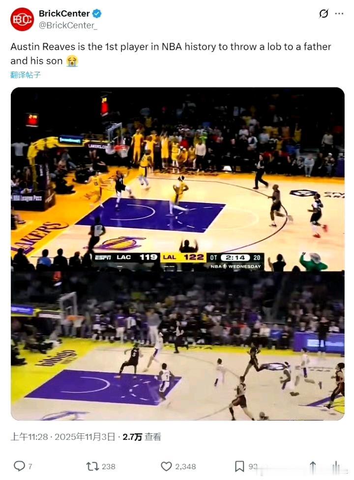 泪目!布朗尼空接暴扣!老父亲坐不住了!NBA第一人,里夫斯一个空接传两代。 里夫斯:“我可能是NBA历史上第一个既给一位父亲传过空接,又给他的儿子传过空接的人。那是一个非常特别的时刻。”