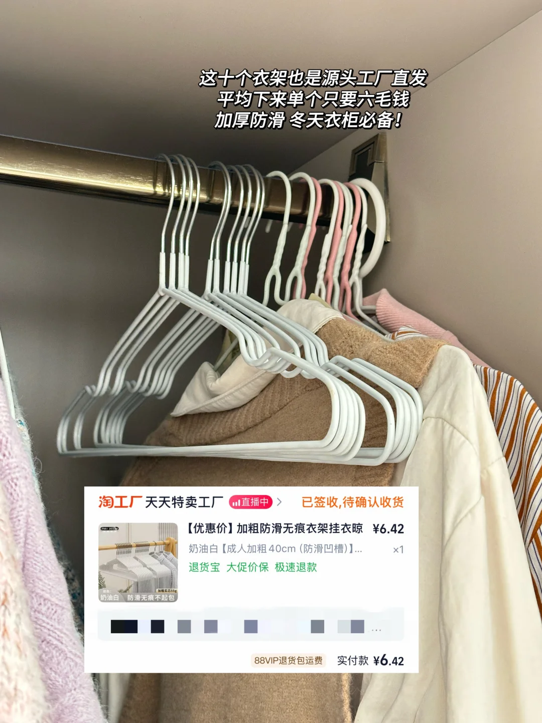 女孩子的东西总是越住越多,前几天换季整理衣服的时候发现衣柜快塞不下了,赶紧断舍离了一下,好几年没穿的衣服赶紧扔了,衣服全部用衣架挂起来,发现衣架不够了,就在淘工厂买了10个衣架,居然只要6.42,平均单个衣架6毛钱,源头工厂直发,还是加粗防滑的,性价比很高!而且都是大家复购了很多次的爆款产品,冬天再买十件打底衫衣柜也能挂得起了!