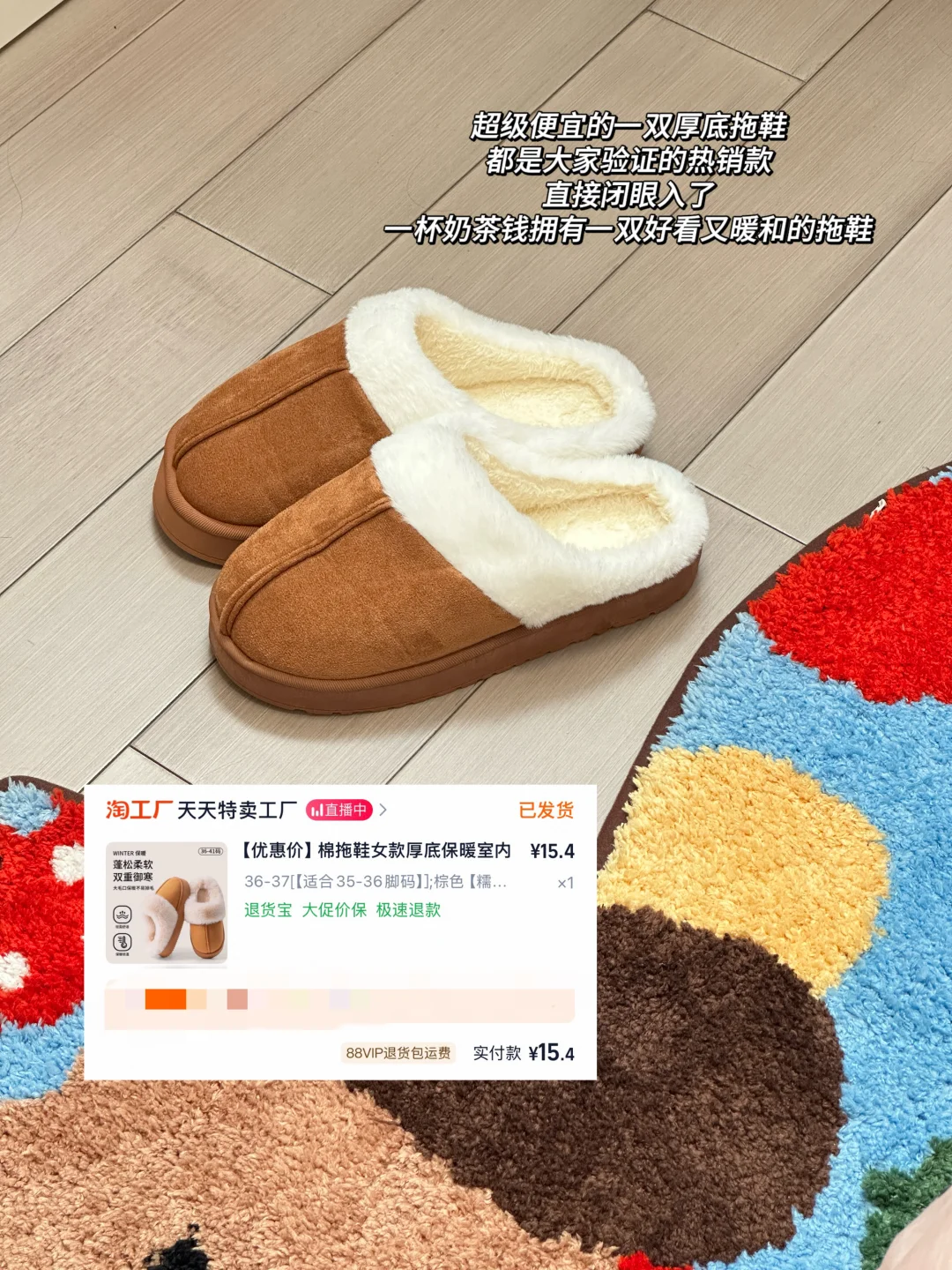 为了叠加活动红包,又凑单买了双厚底拖鞋,也才15.4,一杯奶茶钱🥤,全网热销3w让给我直接闭眼入[哇R],打算带去办公室穿,带毛毛的拖鞋就适合冬天的办公室