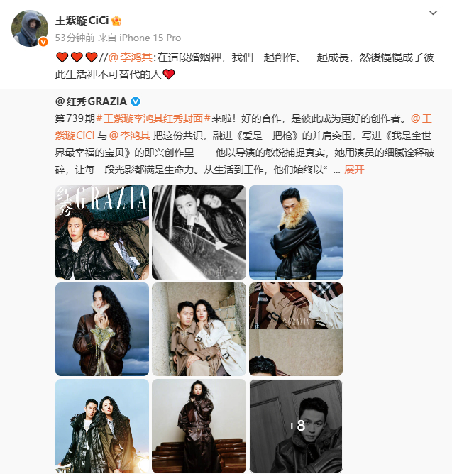 王紫璇李鸿其官宣结婚王紫璇、李鸿其合体登《红秀GRAZIA》封面,李鸿其转发公布两人已婚消息:“在這段婚姻裡,我們一起創作、一起成長,然後慢慢成了彼此生活裡不可替代的人❤️。”王紫璇也转发回应。两人以导演&主演身份已合作《爱是一把枪》《我是全世界最幸福的宝贝》两部电影作品。王紫璇李鸿其红秀封面