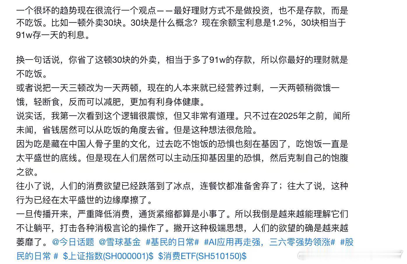 一个很坏的趋势现在很流行一个观点--最好理财方式不是做投资,也不是存款,而是不吃饭。比如一顿外卖30块。30块是什么概念?现在余额宝利息是1.2%,30块相当于91w存一天的利息。
