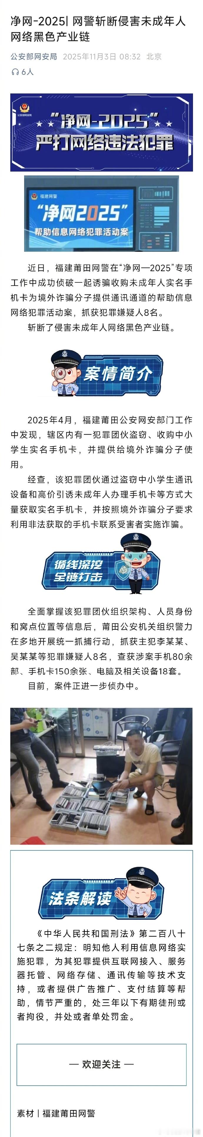 网警斩断侵害未成年人网络黑色产业链近日,福建莆田网警在“净网—2025”专项工作中成功侦破一起诱骗收购未成年人实名手机卡为境外诈骗分子提供通讯通道的帮助信息网络犯罪活动案,抓获犯罪嫌疑人8名,斩断了侵害未成年人网络黑色产业链。