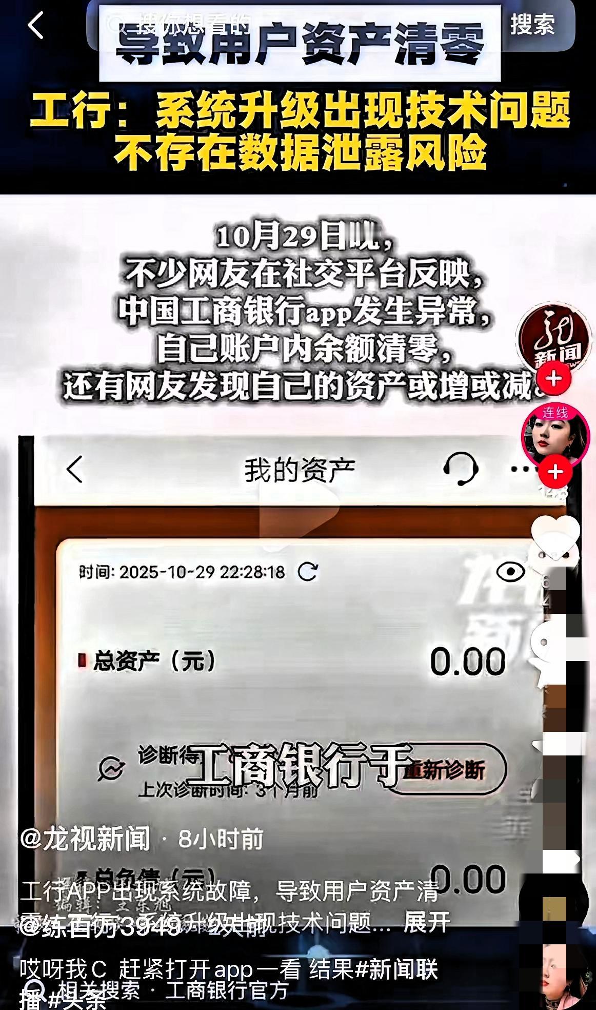 一夜醒来, 工行真出大岔子了, 不是手续费涨了,而是 好多人的账户直接变零了![吓哭] 存款没了,理财蒸发了,连基金持仓都消失了,偏偏信用卡欠款看得一清二楚。 有人半夜看工资到账,结果余额清零,还以为遭了盗刷,客服电话打爆都没人接。等了快20小时,银行才慢悠悠说是“前端显示问题”,钱没丢。 最讽刺的是,工行年报里写着一年砸285亿搞金融科技,还有“零丢失”的灾备体系,结果连个余额显示都能崩。更气人的是,出事后官方一声不吭,全靠客服传话,这哪是解决问题,分明是火上浇油。 钱能恢复,信任碎了可补不回来。我们怕的从来不是数字出错,是银行把“系统故障”当万能挡箭牌,把储户的焦虑当小事。 现在数字时代,咱们的钱早成了屏幕上的一串代码,可银行的责任心不能也跟着“故障”啊。你们当时慌到想报警吗?以后还敢把钱全放一家银行不?评论区说说~