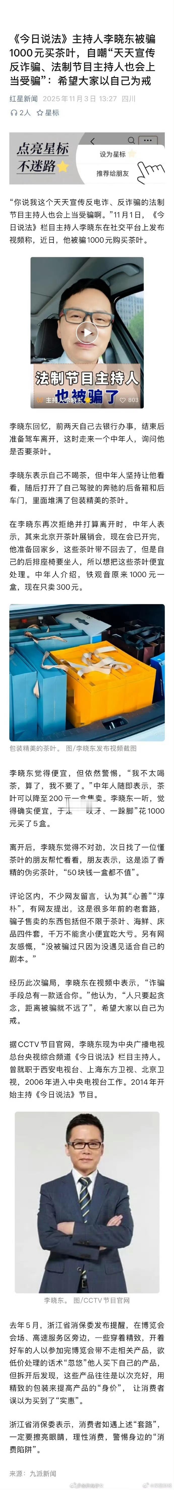 今日说法主持人被骗1千元买茶叶自嘲“天天宣传反诈骗、法制节目主持人也会上当受骗”:希望大家以自己为戒 [吃瓜]