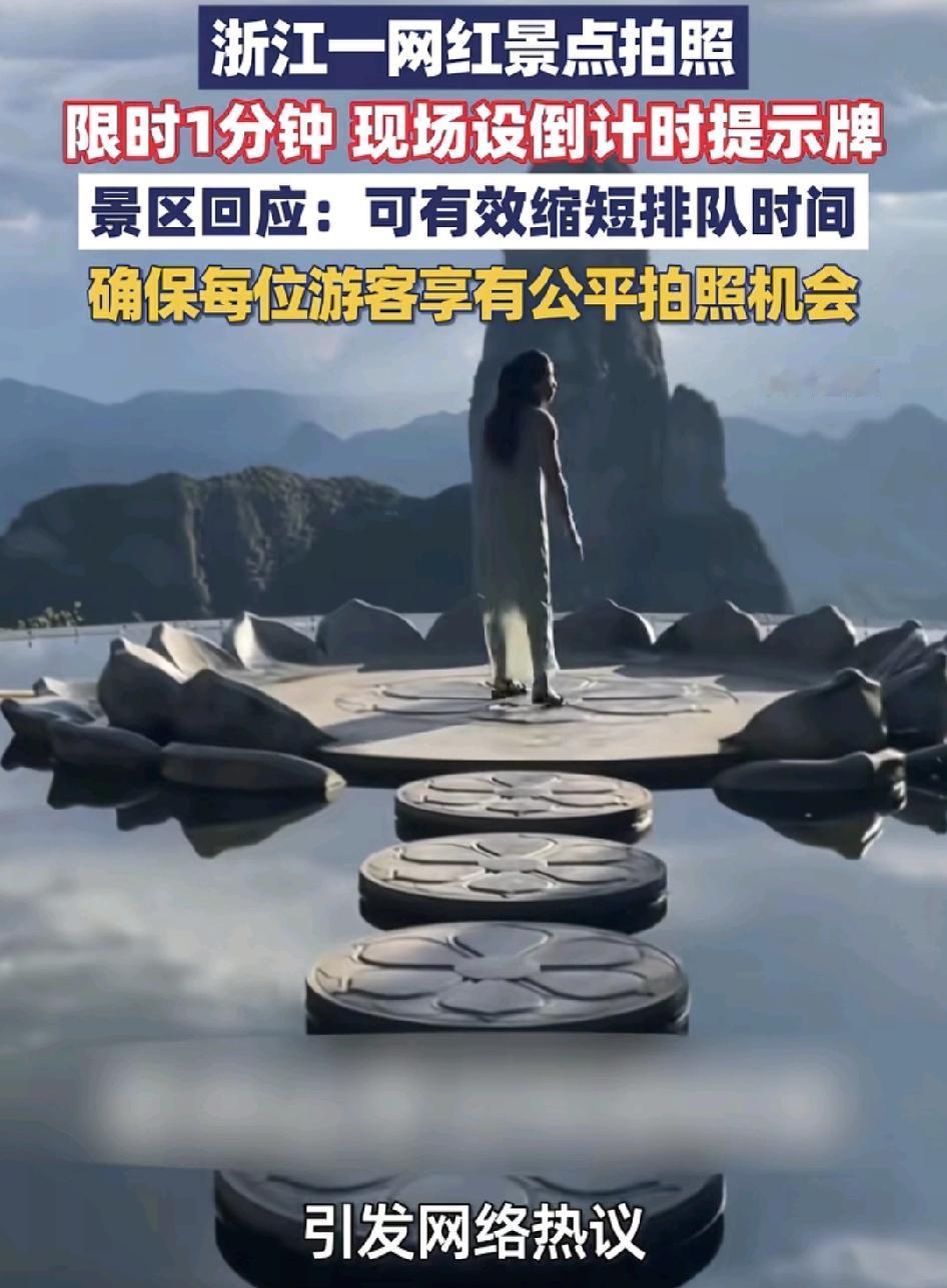 浙江台州一网红景点“佛影莲子韵”限时拍照,引发热议。不少游客反映景点有工作人员不断的提醒,也有倒计时设备提醒游客,限时一分钟拍照。景区方面表示,为了缩短大家排队的时间,提升游览体验,每个游客仅限于一分钟的拍照时间。据说景点人多的时候,大家排队时间长达3~5个小时。很多网友建议这样的管理方式可以全国推广,让每位游客都能公平的享受景点的打卡拍照,也会减少一些矛盾冲突的发生。